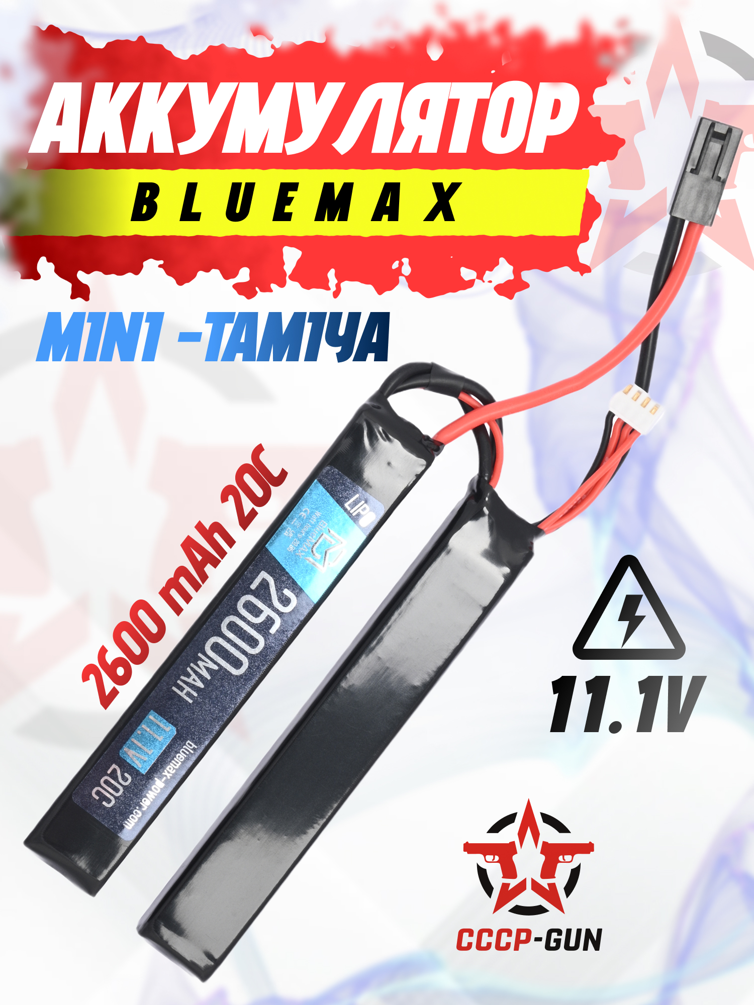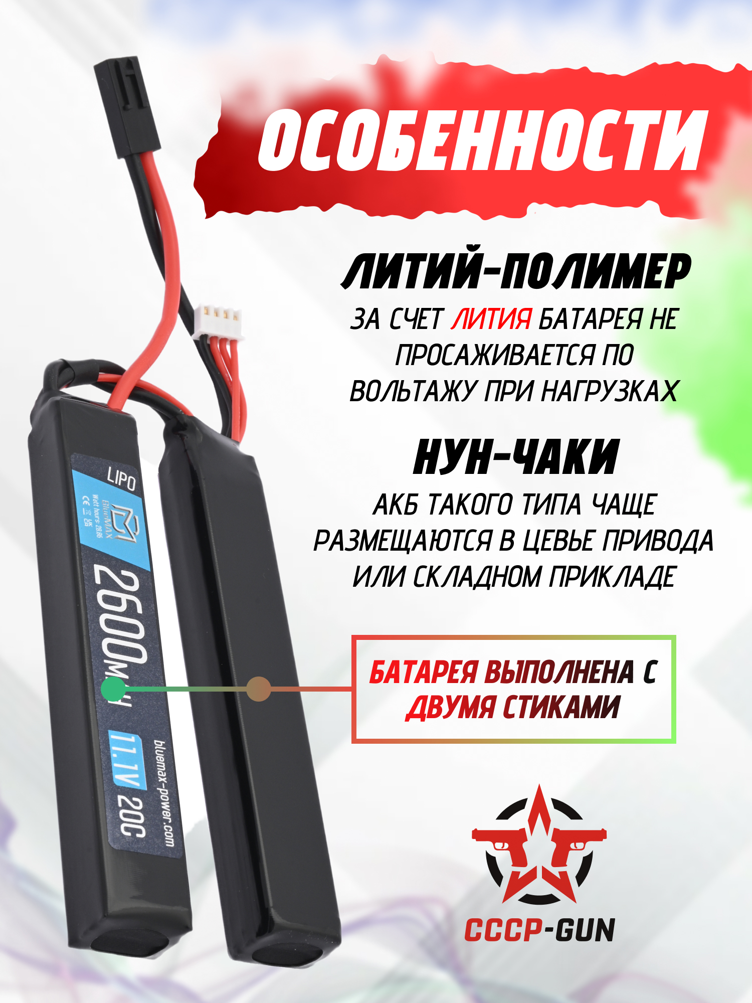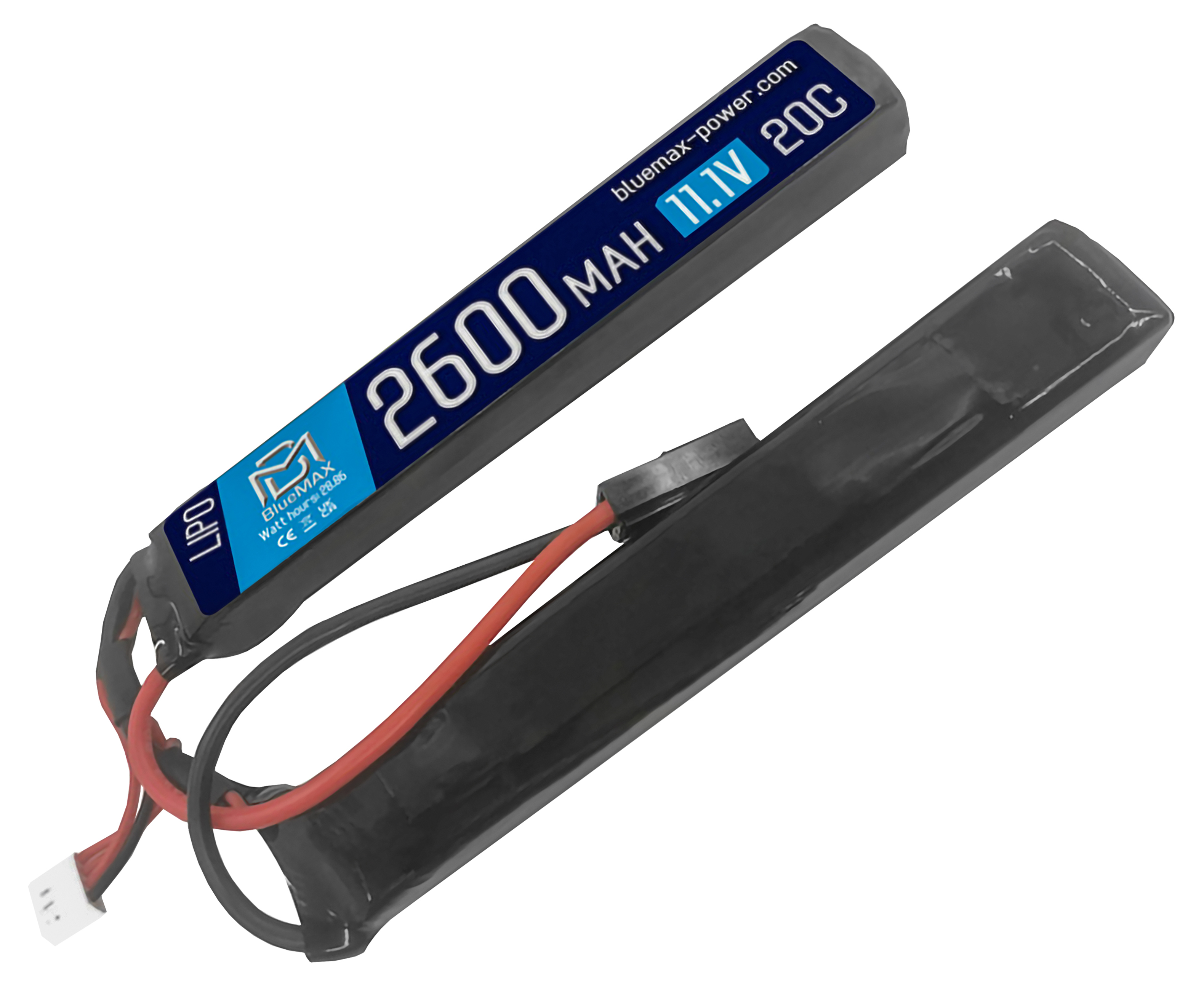 Рассматриваемый аккумулятор Li-Po 11.1V 2600mAh 20C Nunchuck 2x выступает примером - он выполнен в формате CQB. Отмеченный типоразмер обширно применяется в системах M-серии. Конструкция реализована в виде двухсекционных нунчак с габаритами отдельного модуля 12.5x21x128 мм - учитывая компактные размеры, батарея BlueMax без затруднений размещается в полости приклада, направляющей телескопического плечевого упора или во внутреннем пространстве цевья.