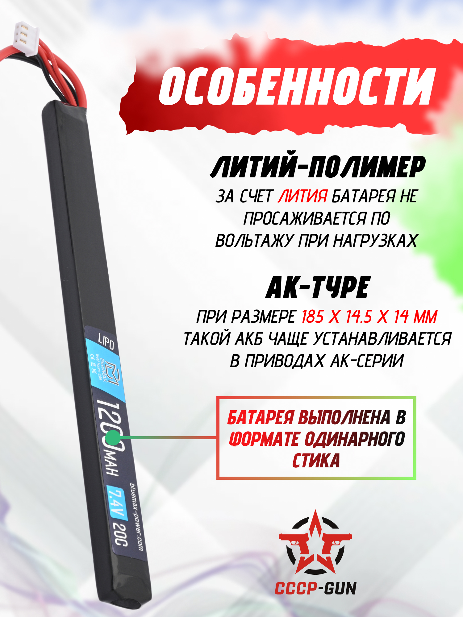 Аккумулятор BlueMax Li-Po 7.4V 1200mah 20C Stick (13.3x21x128 мм, G36, М-серия, Мини-Тамия)