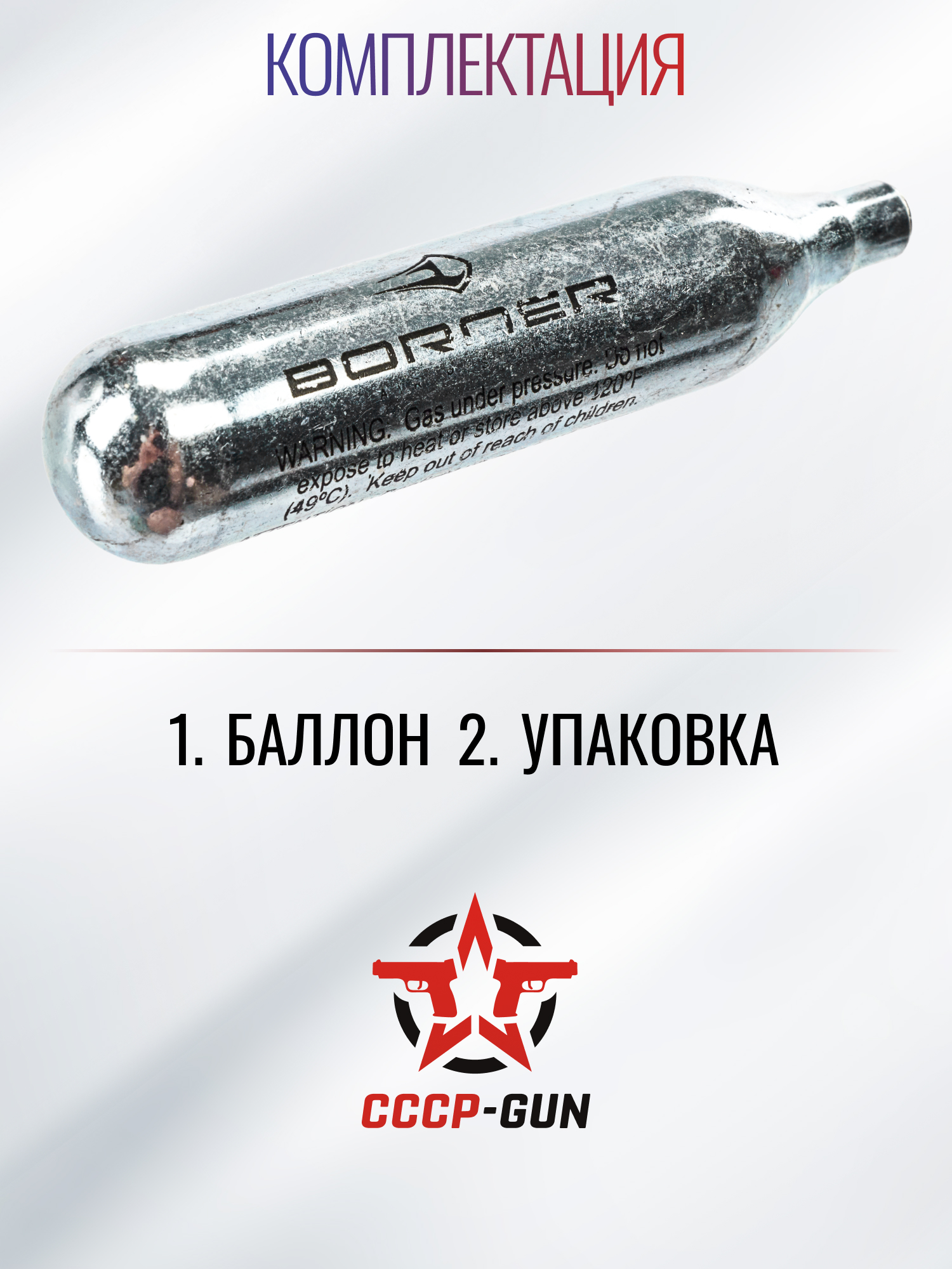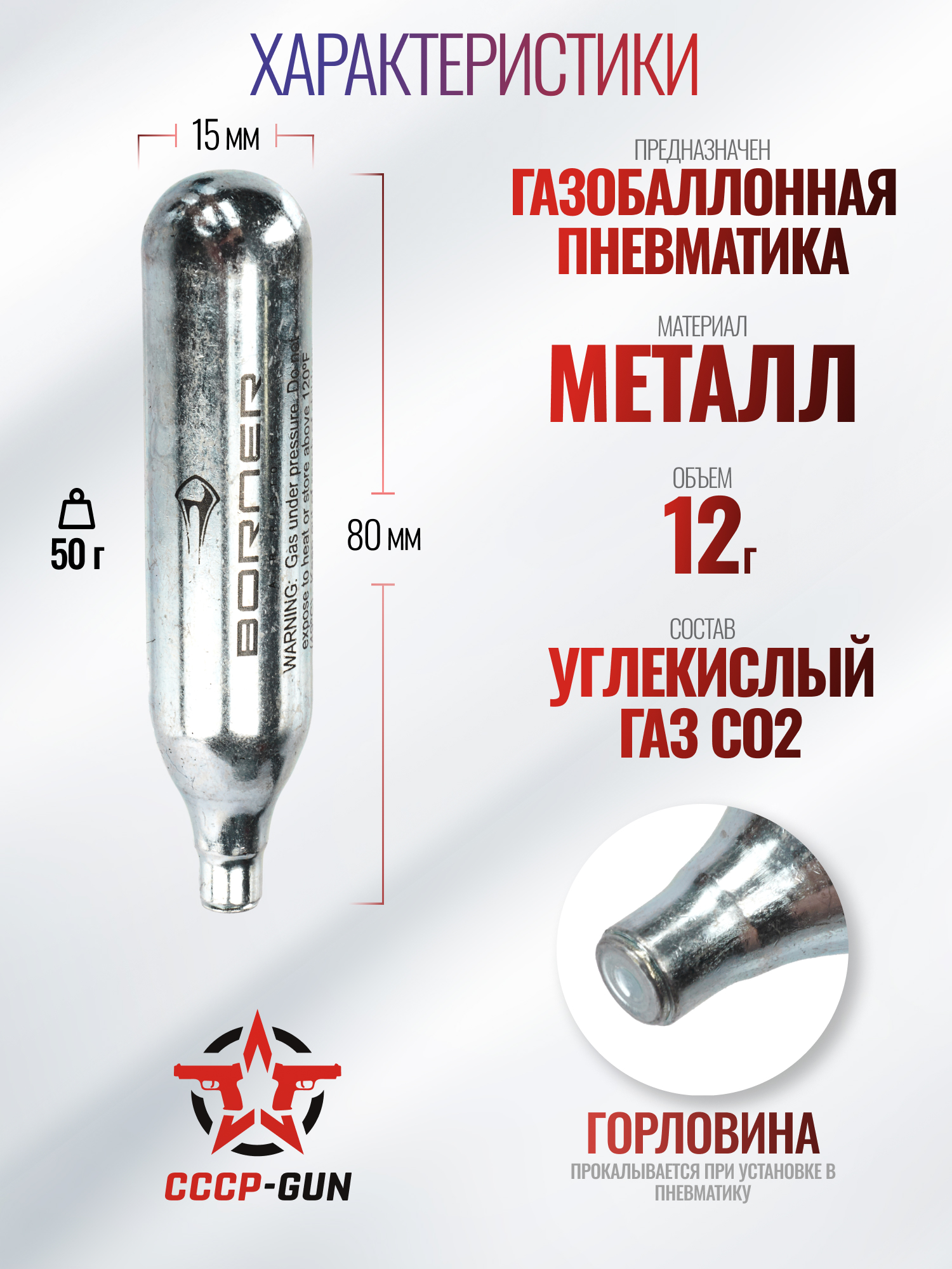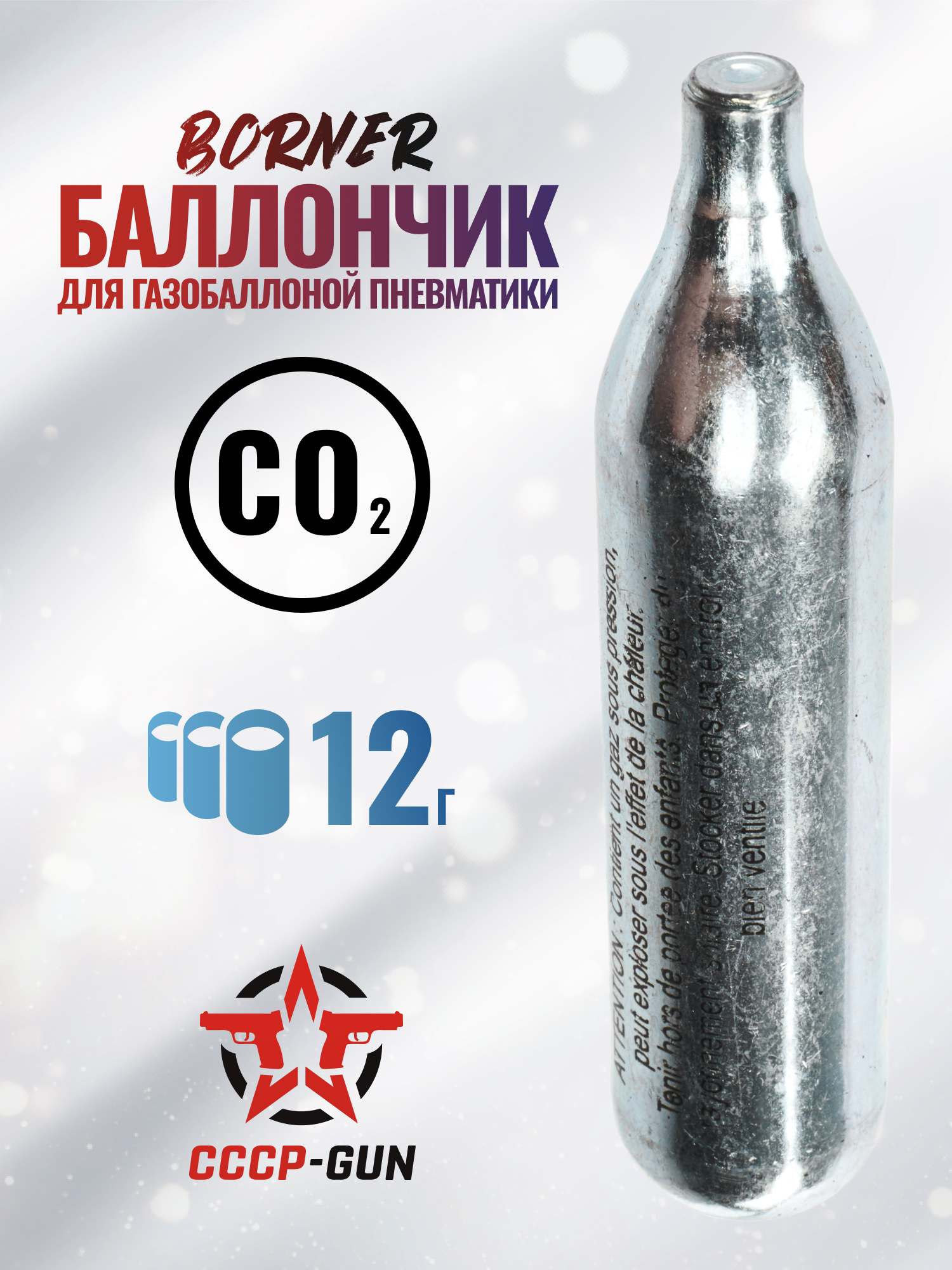 Баллончик CO2 Borner представляет собой классический резервуар, предназначенный для установки в пистолеты, винтовки и револьверы с газобаллонной схемой. Вместимость модели составляет 12 грамм углекислоты, а геометрия обозреваемого изделия универсальна и совместима с большинством платформ, использующих этот газ в качестве энергетического элемента. Объема хватит для проведения полноценной тренировочной сессии, в особенности при обращении с оружием небольшого калибра.