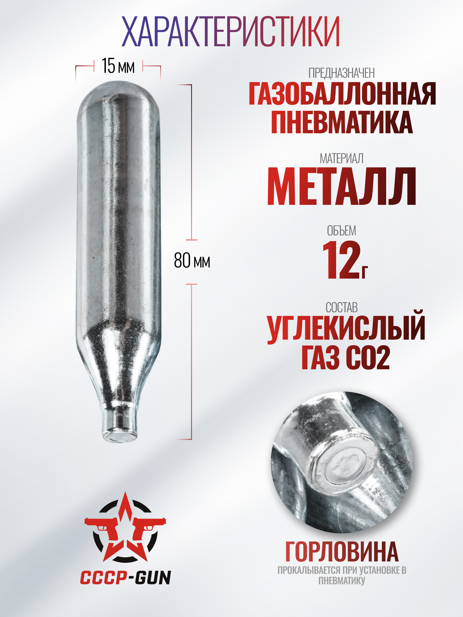 Рассматриваемые 12 граммов баллончики выполнены из металлического сплава. Прочный корпус исключает риск повреждений и утечек, а его герметичность в свою очередь обеспечивает полную отдачу содержимого при использовании. Все резервуары одноразовые, они не предназначены для повторной заправки.