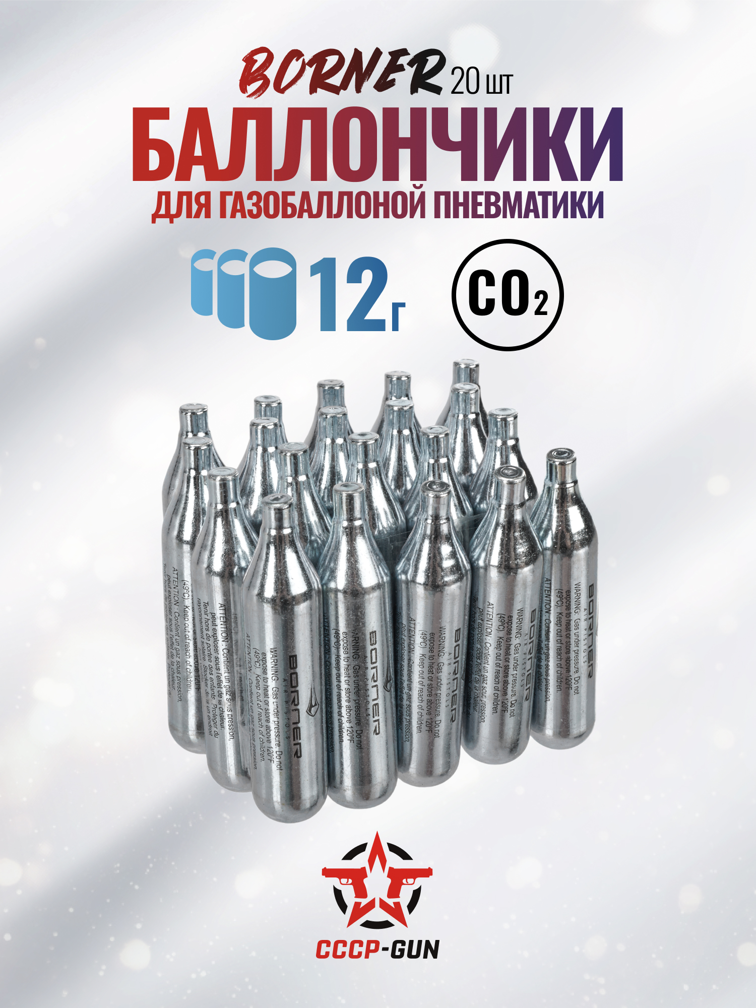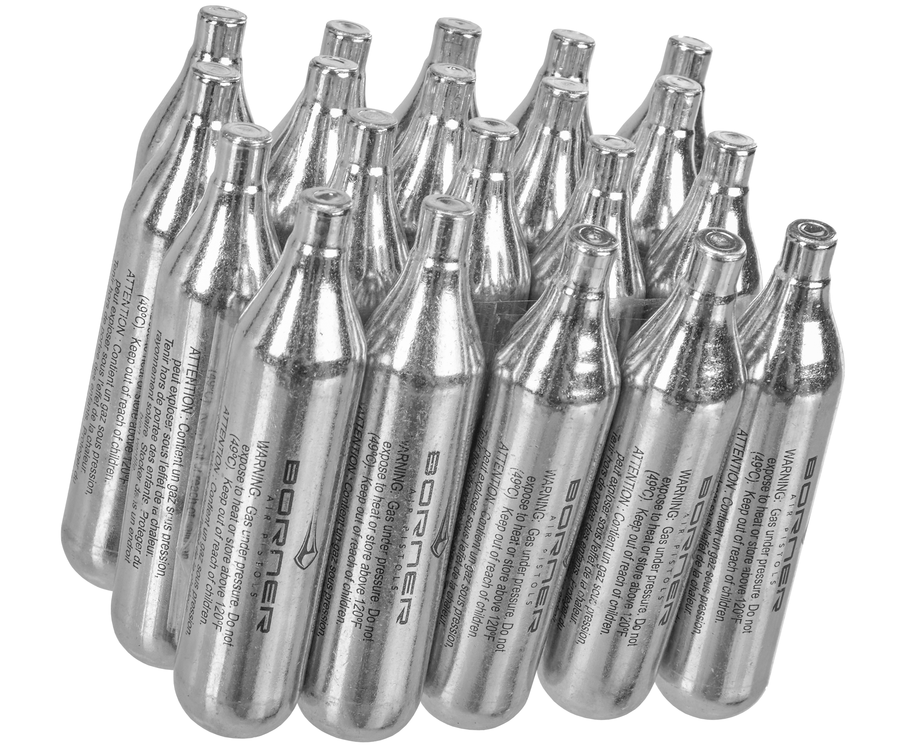 Компания Borner, помимо выпуска пневматики, также делает для нее разнообразные расходные материалы - в том числе баллончики с углекислотой. В этом случае предлагается комплект из 20 единиц - получив такой запас можно продолжительное время не вспоминать о необходимости пополнения. В этом исполнении представили емкости с маркировкой изготовителя.
