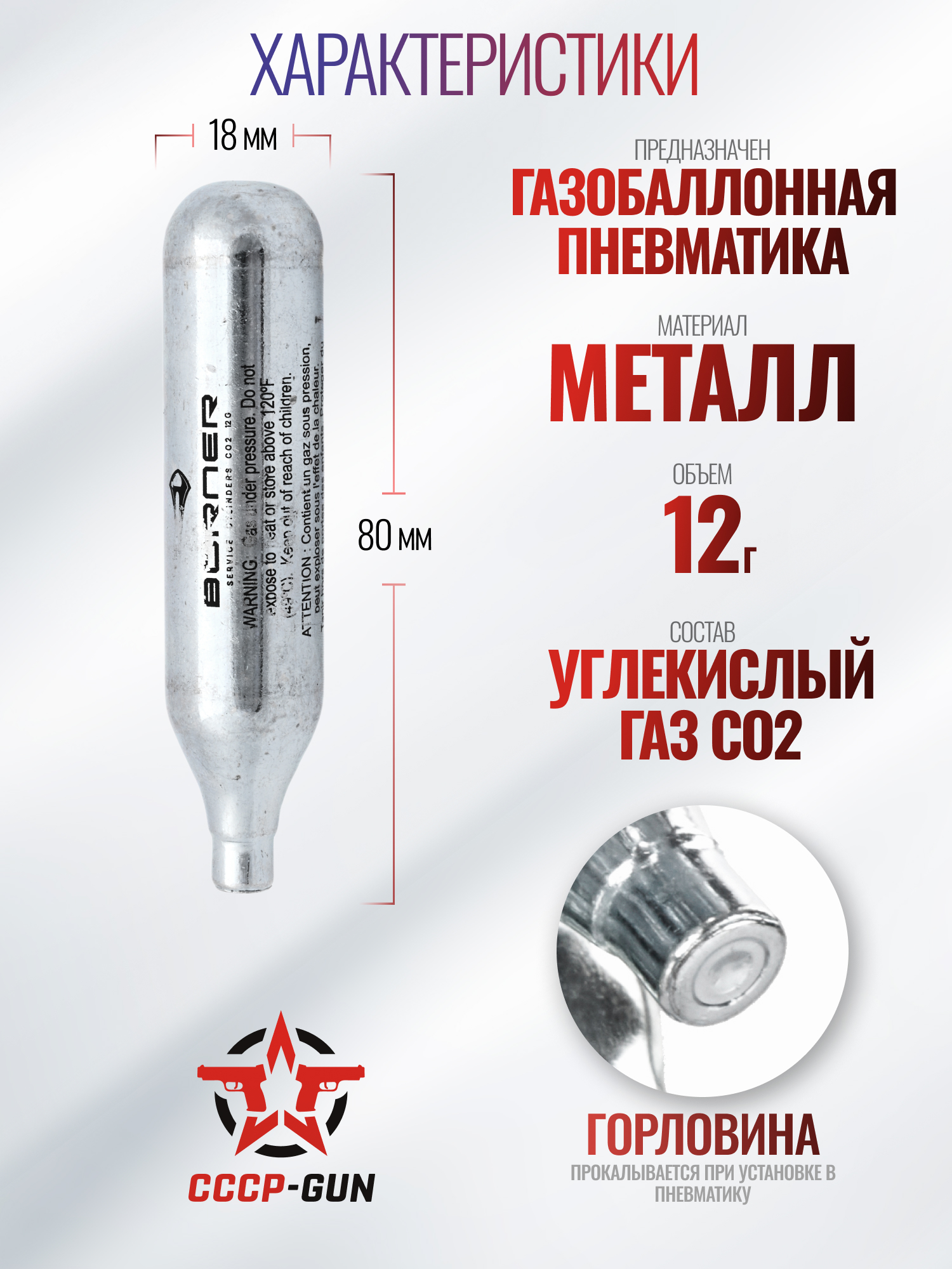 Каждый баллон СО2 вмещает 12 грамм углекислого газа. На практике такого количества хватает для проведения полноценной тренировки из пистолета калибром 4.5 мм, а в случае со страйкбольными образцами расход будет еще меньше. Рассматриваемый форм-фактор стал первым по востребованности - соответственно баллончики Борнер подходят к подавляющему числу пневматики.