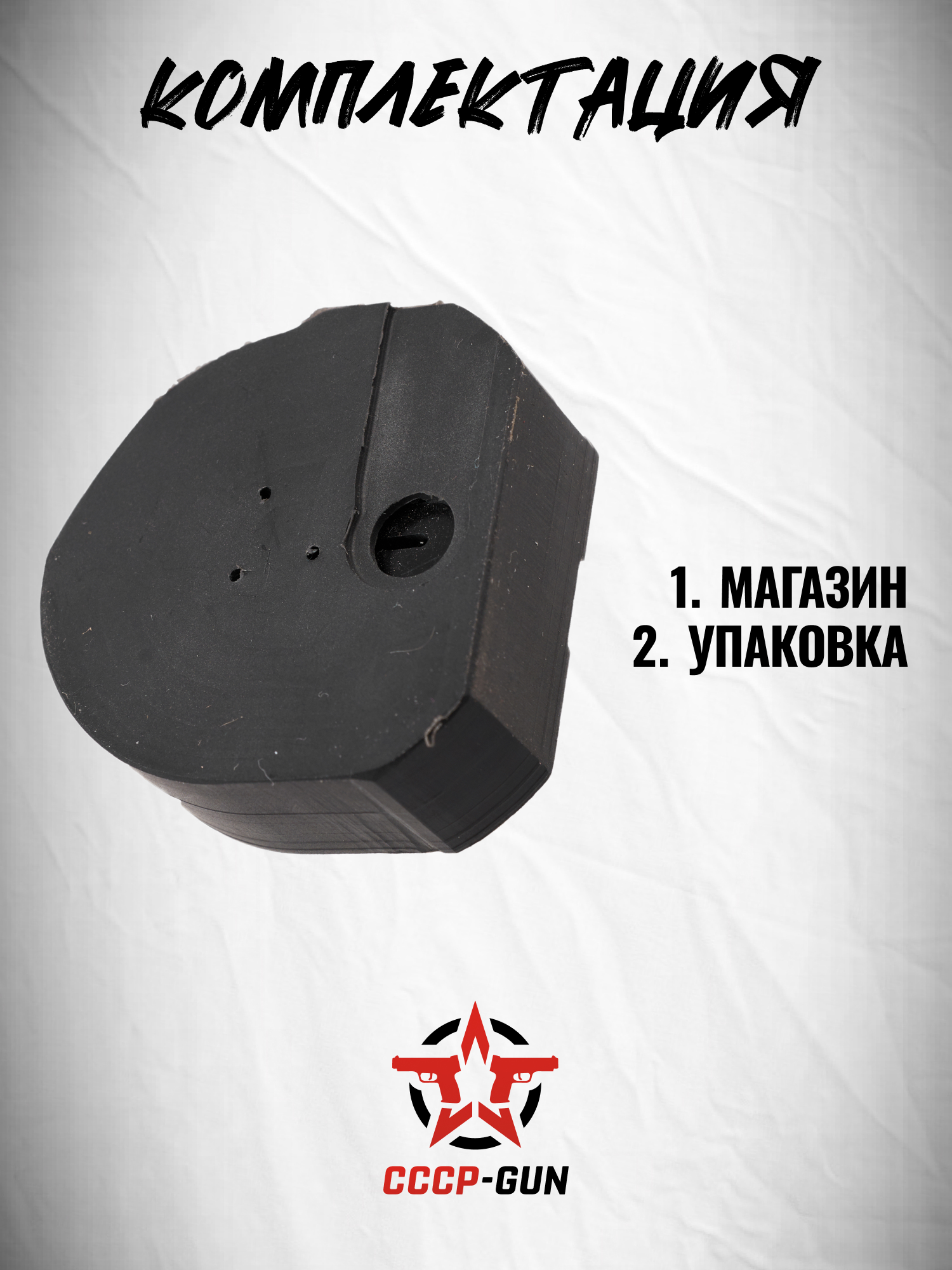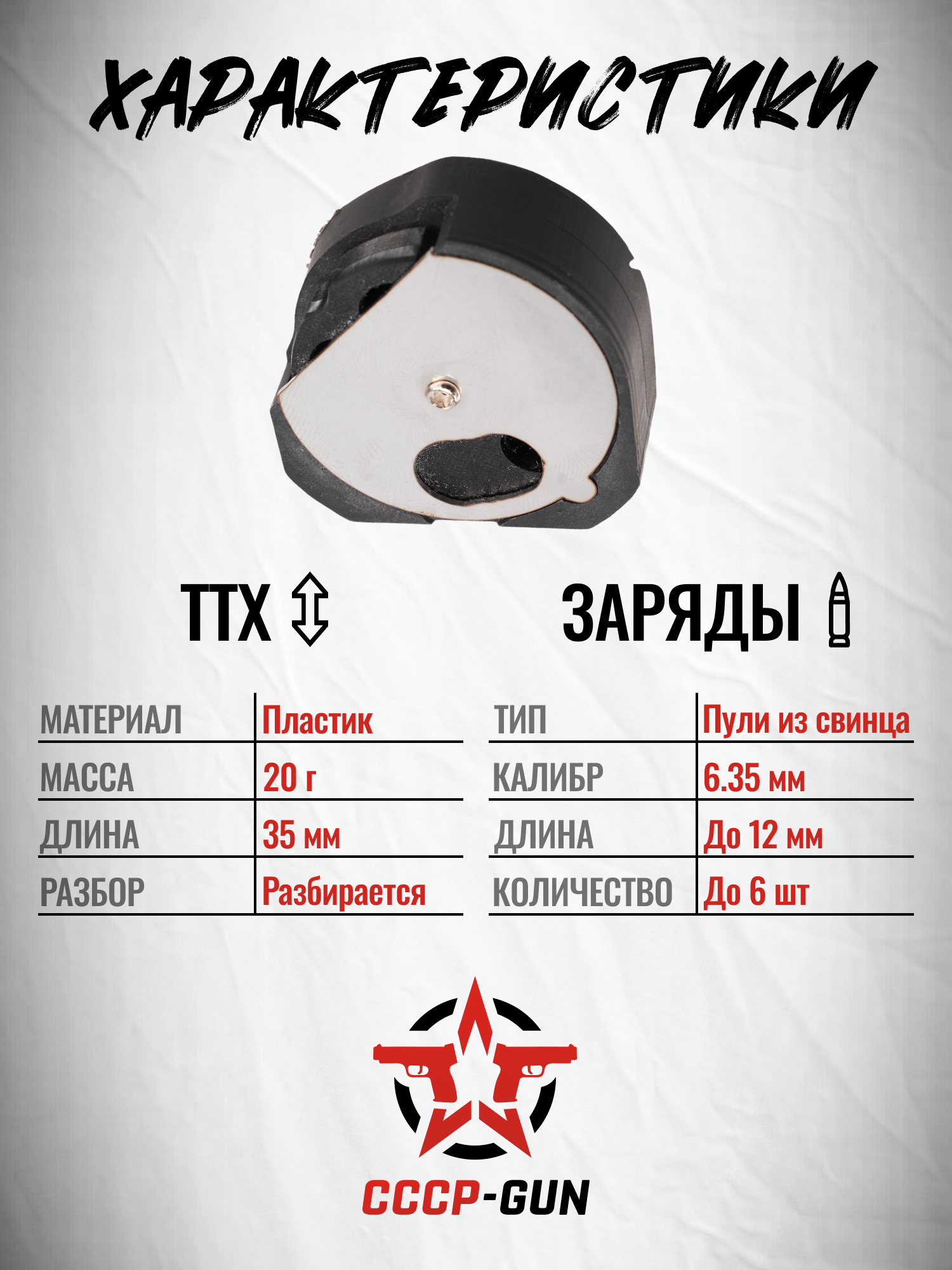 Магазин для пуль калибра 6.35 мм выполнен с возможностью разборки: винт на его крышке откручивается. Это позволяет очищать внутреннюю поверхность от загрязнений и продлевает срок службы экземпляра.