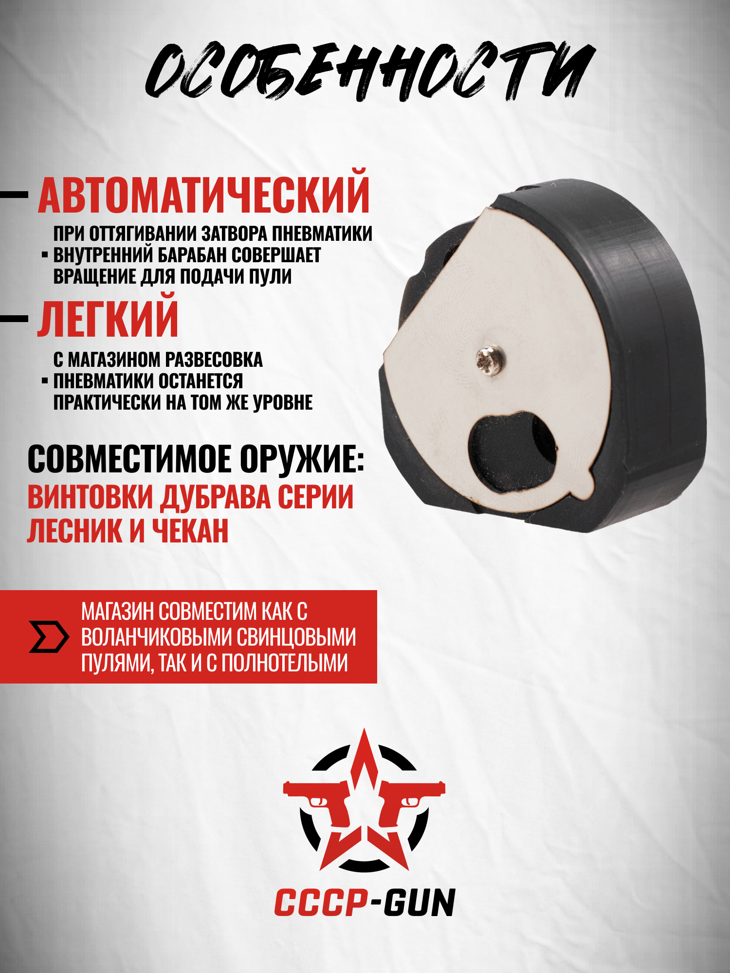 Изделие рассчитано на 6 штук воланчиковых свинцовых пуль. Архитектура барабана учитывает параметры винтовки Лесник и карабина Чекан, и гарантирует полную совместимость с ними. Экземпляр используется вместо однозарядного лотка.