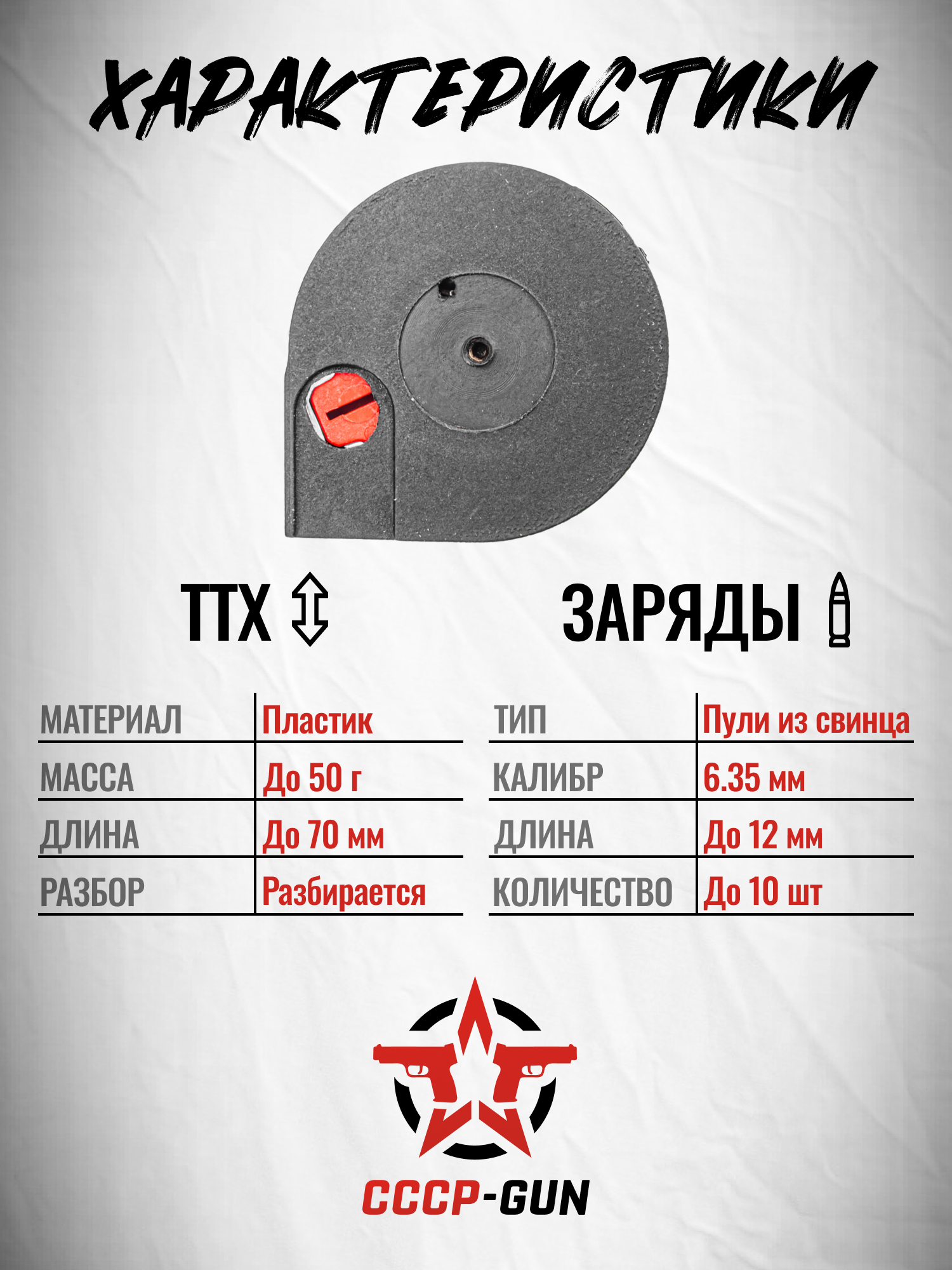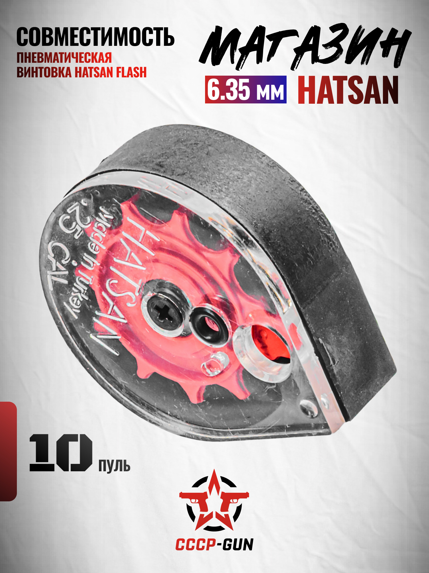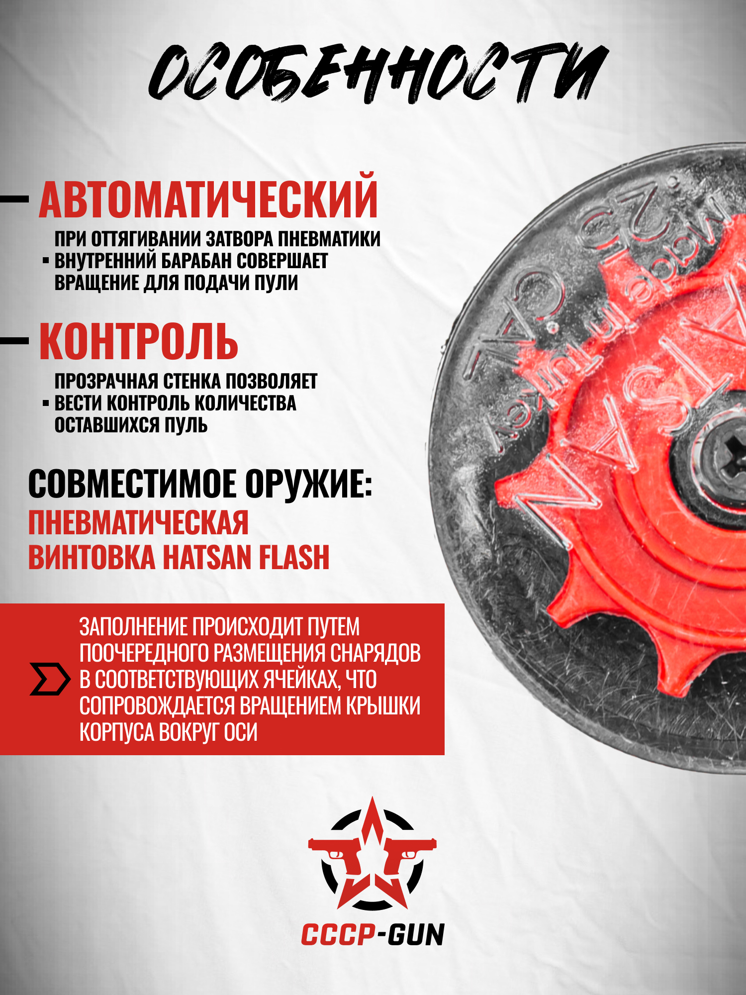 Представленный магазин предназначен для установки на винтовку Hatsan Flash - этот экземпляр рассчитан на калибр 6.35 мм. Образец предусматривает функцию автоповорота - после прохождения пульки в казенник и последующего движения досылателя назад держатель зарядов прокрутится, выставив следующий боеприпас на линию ствола. Соответственно проворачивать изделие вручную не потребуется.