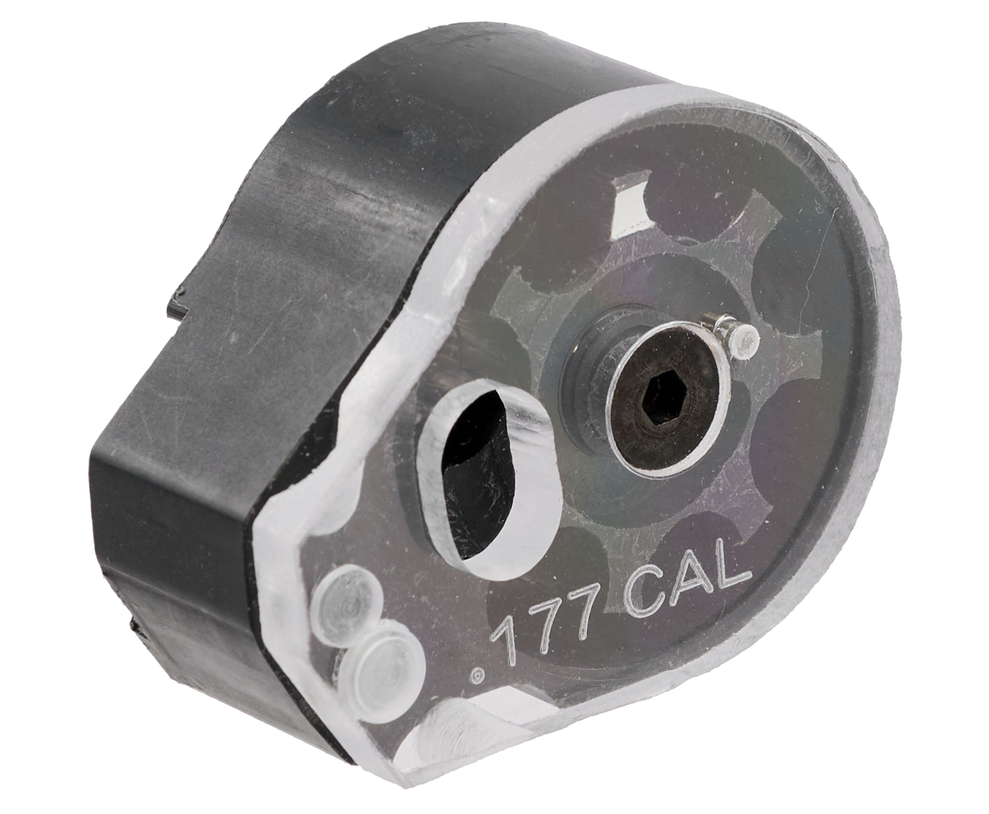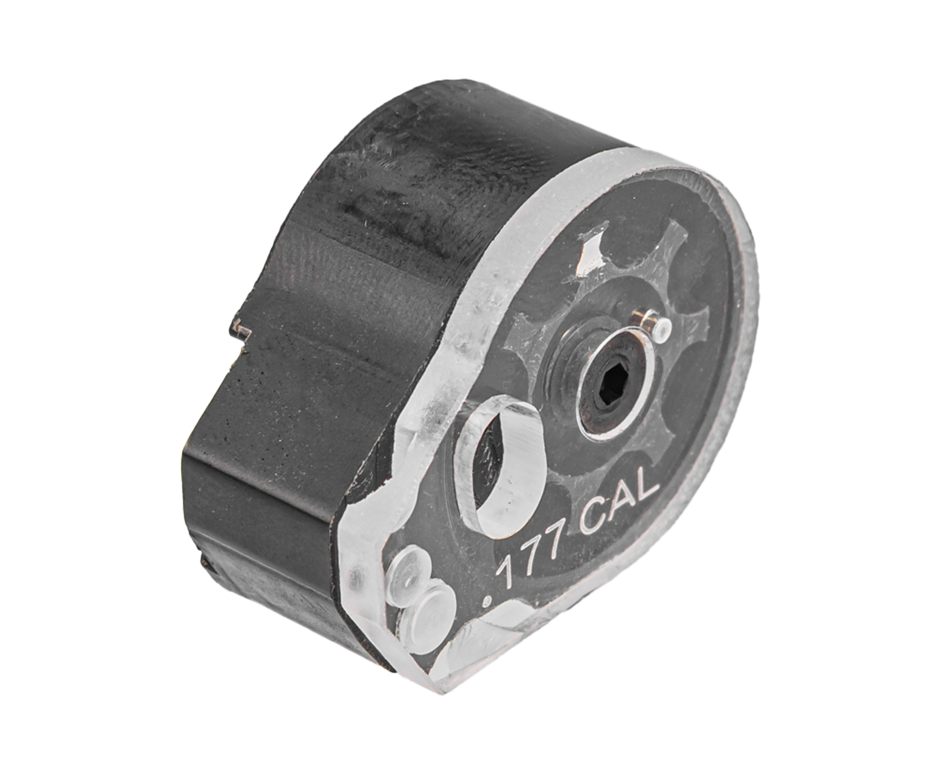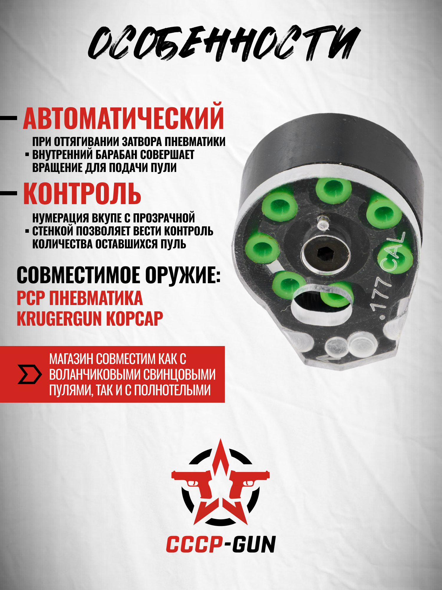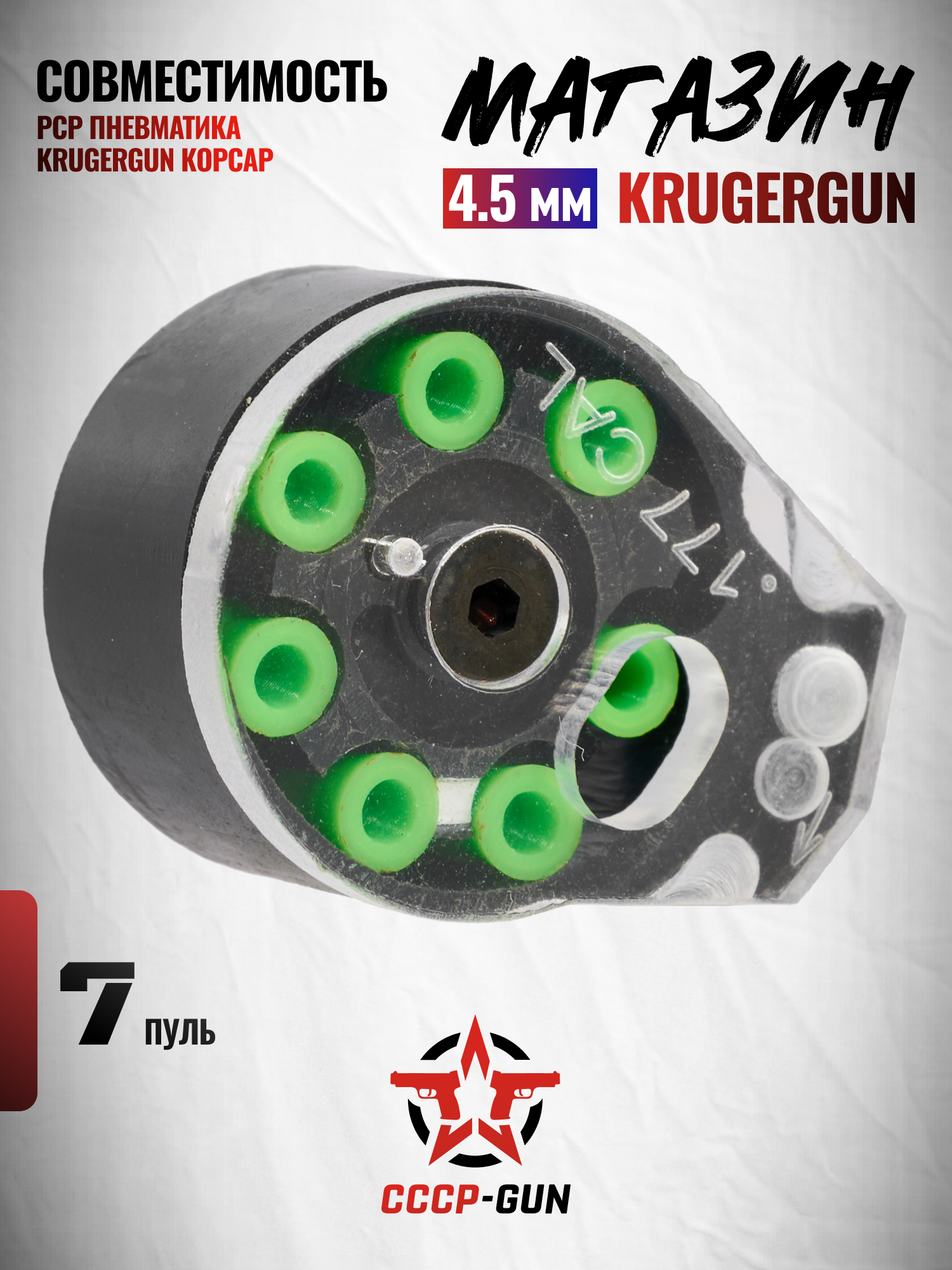 Следуя такой тенденции, был создан барабанный магазин, совместимый с линейкой PCP пистолетов КрюгерГан Корсар от этого же изготовителя. Его установка осуществляется с правой стороны корпуса платформы. Посадка плотная, модель не нуждается в дополнительной фиксации.
