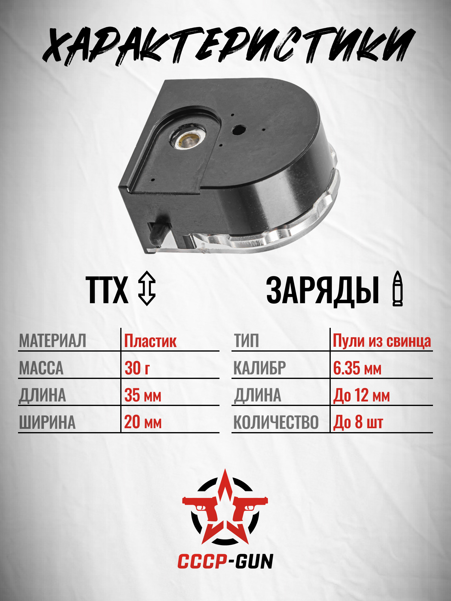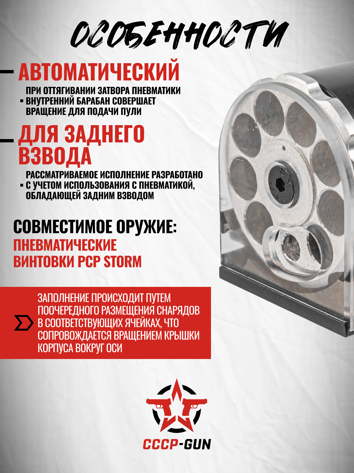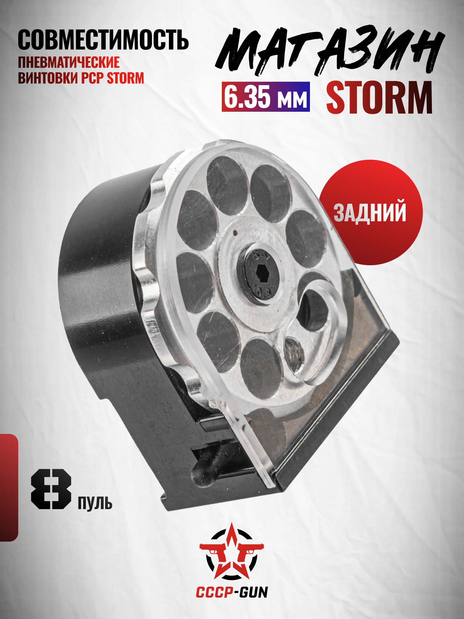 Упомянутое барабанное магазинное устройство обладает полной совместимостью с винтовками Шторм, предназначенными для использования боеприпасов 6.35 мм - внутреннее устройство включает в себя блок, обеспечивающий автоматическое проворачивание с реализацией принципа отложенного досылания. Модель изготовлена с применением элементов из металлического сплава и полимера.