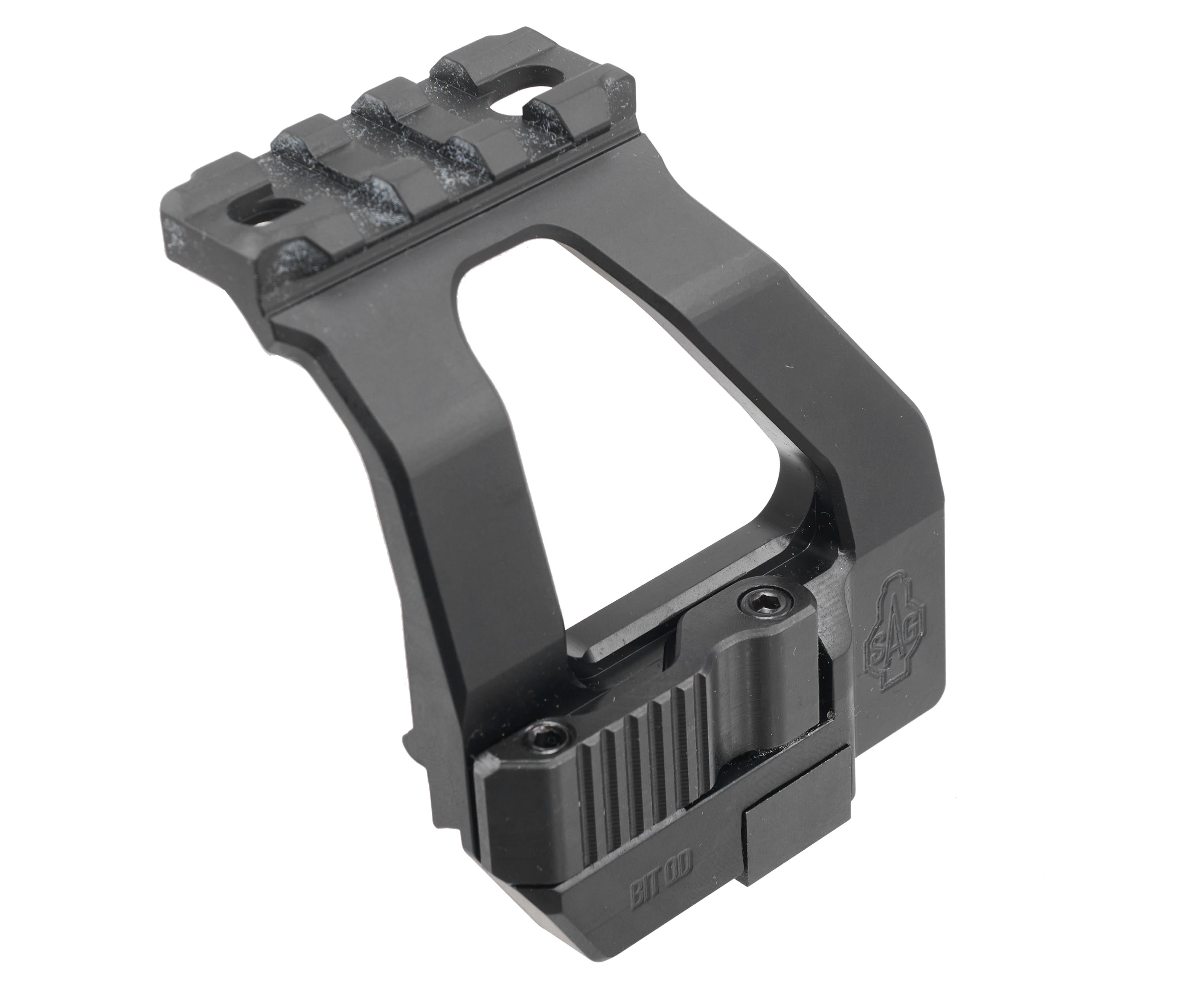 Кронштейн SAG боковой быстросъемный Picatinny выполнен из алюминия, материал выдерживает нагрузки при стрельбе. При весе 0.1 кг модель не будет перегружать карабин или автомат и влиять на его развесовку.