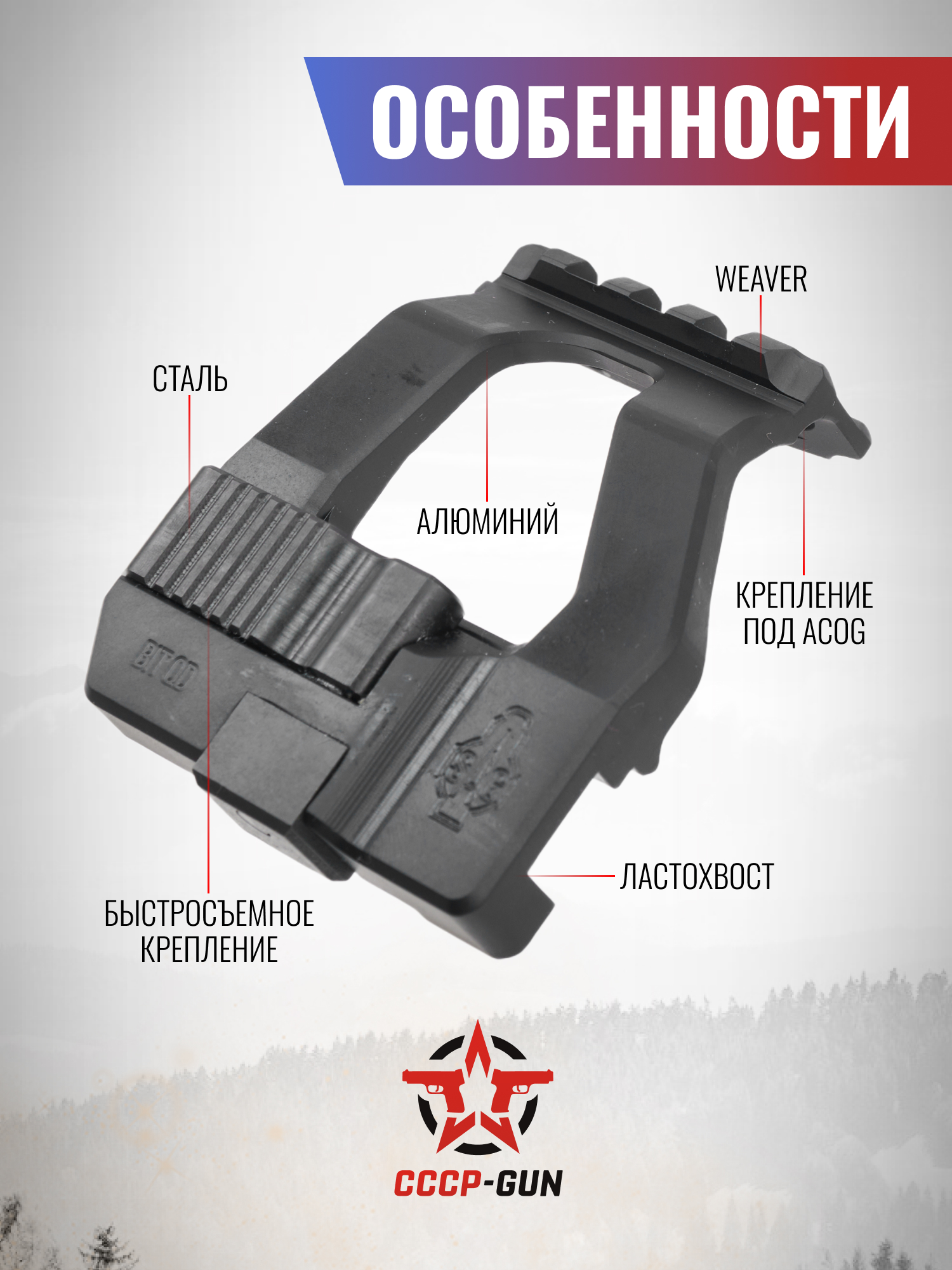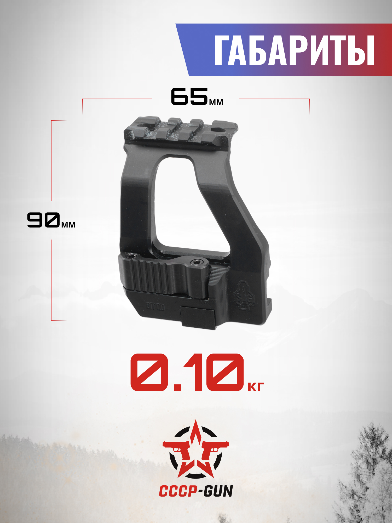 Экземпляр совместим с карабинами и автоматами на базе АК, оснащенными боковой направляющей «Ласточкин Хвост». Быстросъемный механизм помогает легко установить и демонтировать деталь без применения инструментов, это полезно при необходимости быстрой смены конфигурации. Отличие этого изделия производителя от других кронштейнов в уменьшенных габаритах модели, такая конструкция не будет мешать навесному оборудованию и отвлекать владельца.