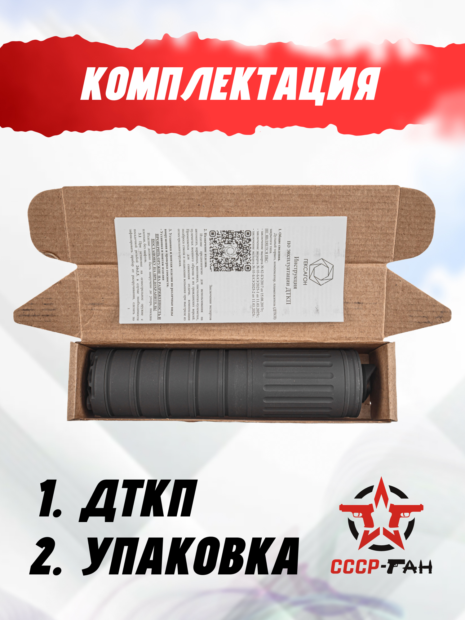 Задача дульного тормоза компенсатора заключается в снижении отдачи за счет перераспределения вектора движения потока выходящих из ствола газов. В случае с ДТК закрытого типа добавляется еще одно свойство - такое устройство способно снизить громкость выстрела для более комфортной и безопасной работы с оружием. В случае с изделиями Гексагон этот параметр может снижаться на 25-30 Децибел.