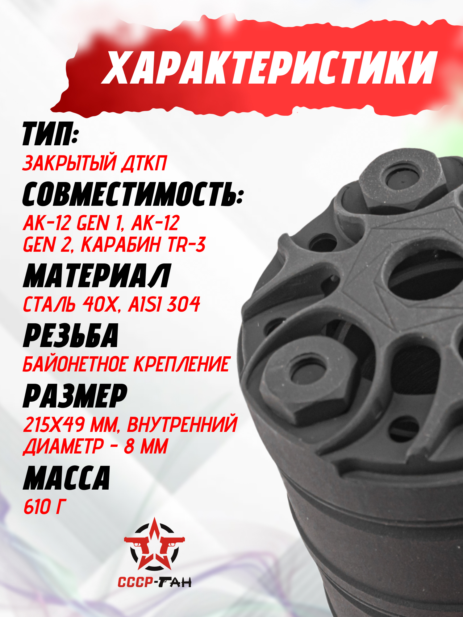 Рассматриваемый образец ДТКП разрабатывали под автомат АК 12. В отличие от иных моделей серии в этом случае установка производится не на резьбу, а на быстросъемное байонетное крепление, которое позволит поставить и снять прибор в одно действие. При этом соблюдается соосность насадки и канала ствола.