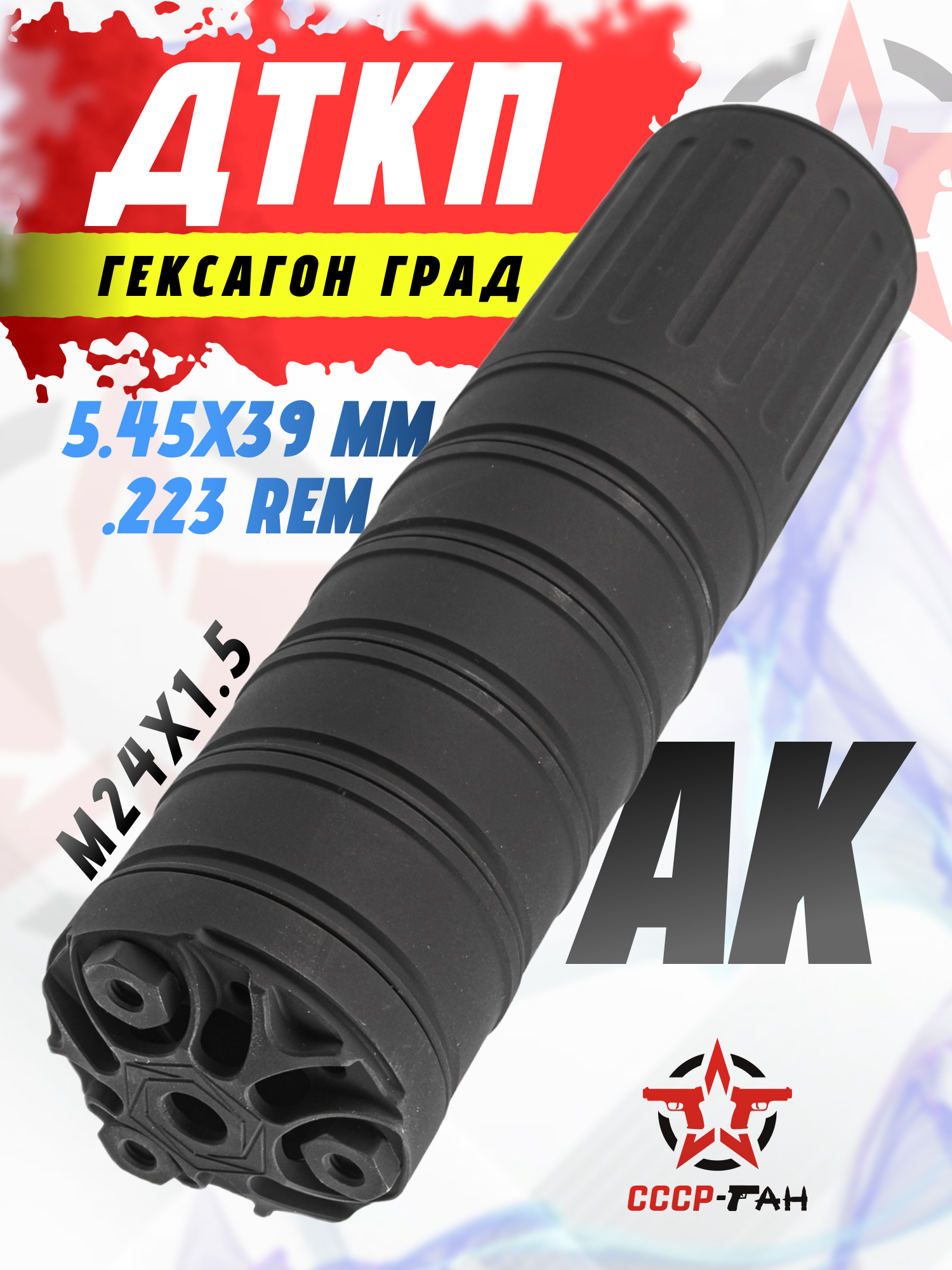 Внутренняя схема сбалансирована ради предотвращения формирования избыточного давления, что гарантированно блокирует возврат газовой массы сквозь нарезной канал прямо в ствольную коробку. Представленная банка Гексагон 5.45 вытачивается из комбинации сплавов 40Х и AISI303, что напрямую увеличивает заложенный период эксплуатации, достигающий 7000 выстрелов - наружные плоскости дополнительно покрываются специализированным термостойким антикоррозийным составом.