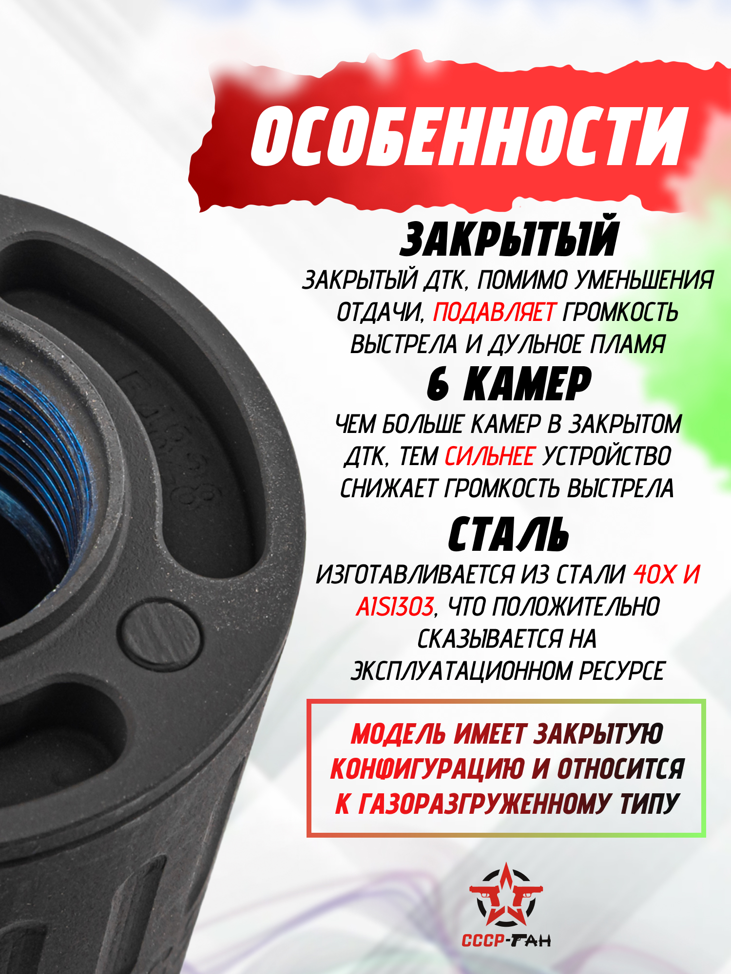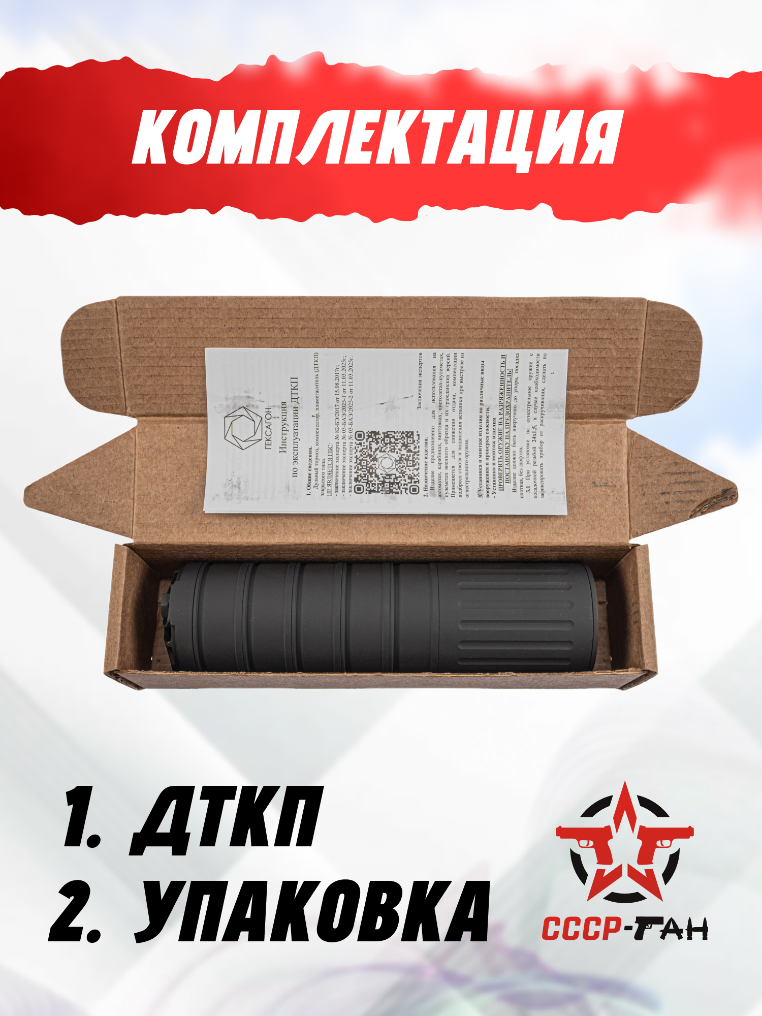 Банка обладает закрытым профилем корпуса и спроектирована по газоразгруженной схеме. Внедрение 6 камер гарантирует планомерное падение темпа движения пороховых элементов вкупе с дозированным рассеиванием среды по внутреннему объему цилиндра и финальным выбросом. Указанный алгоритм вызывает подавление звукового импульса при выстреле до 30-32 дБ и нивелирует вспышку.