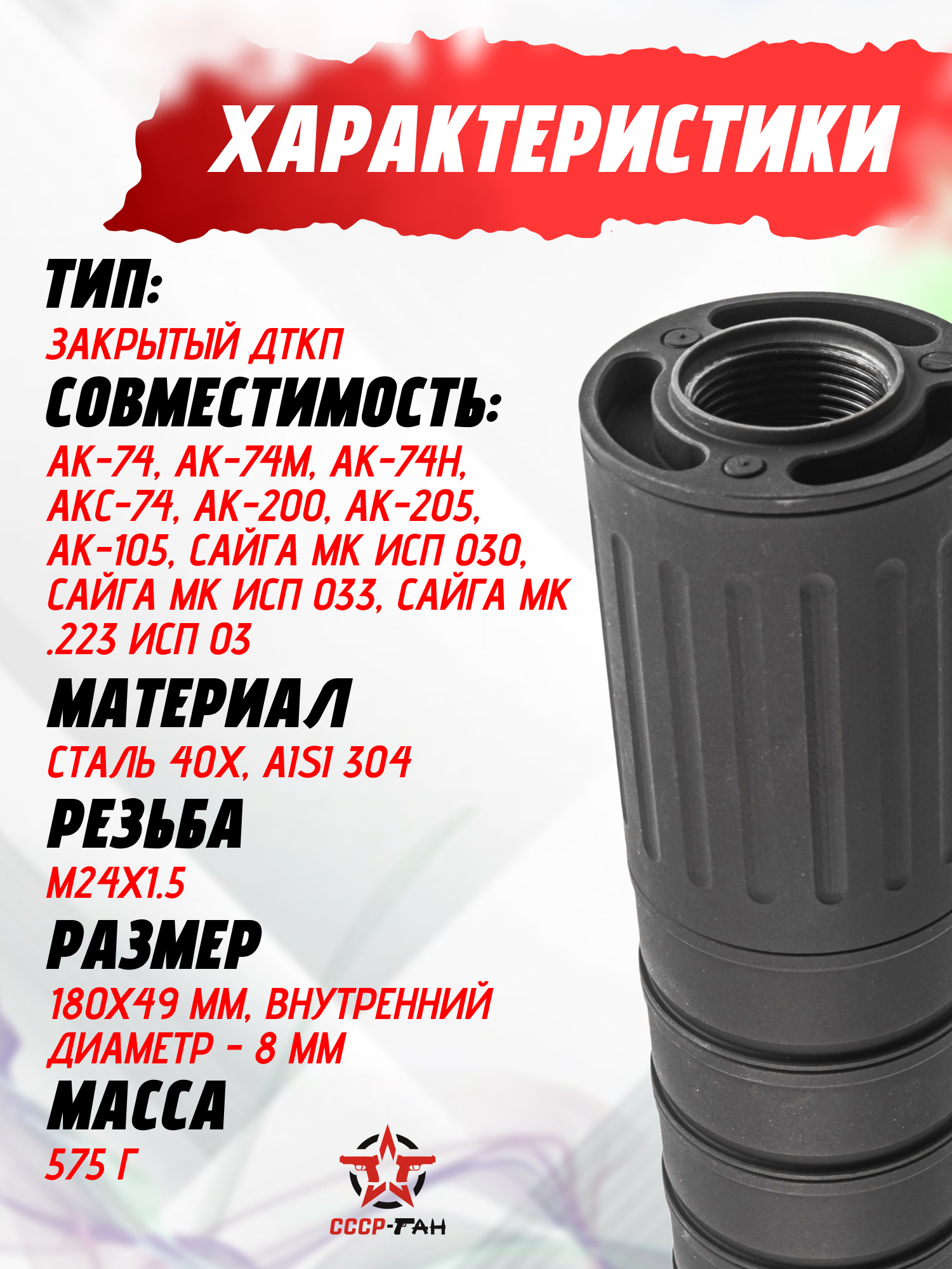Габариты устройства составляют 18x4.9 сантиметра - при таких значениях разработчикам удалось зафиксировать вес на отметке 0.575 килограмма. Жесткая стыковка реализуется методом вращения ДТКП по резьбовому интерфейсу M24x1.5 непосредственно на дульном срезе бланка без привлечения вспомогательного инструмента, что допускает оперативную сборку в полевых условиях.