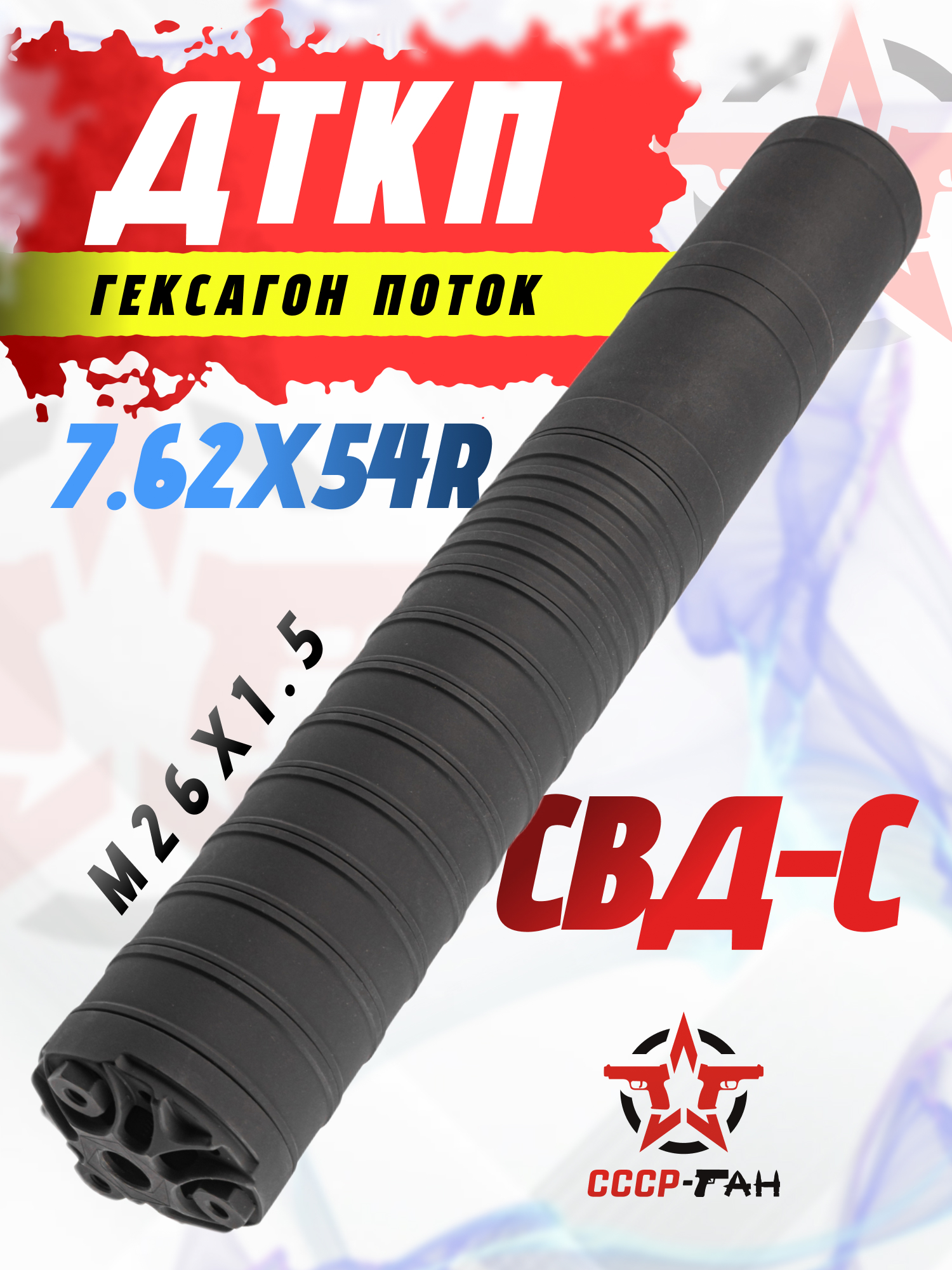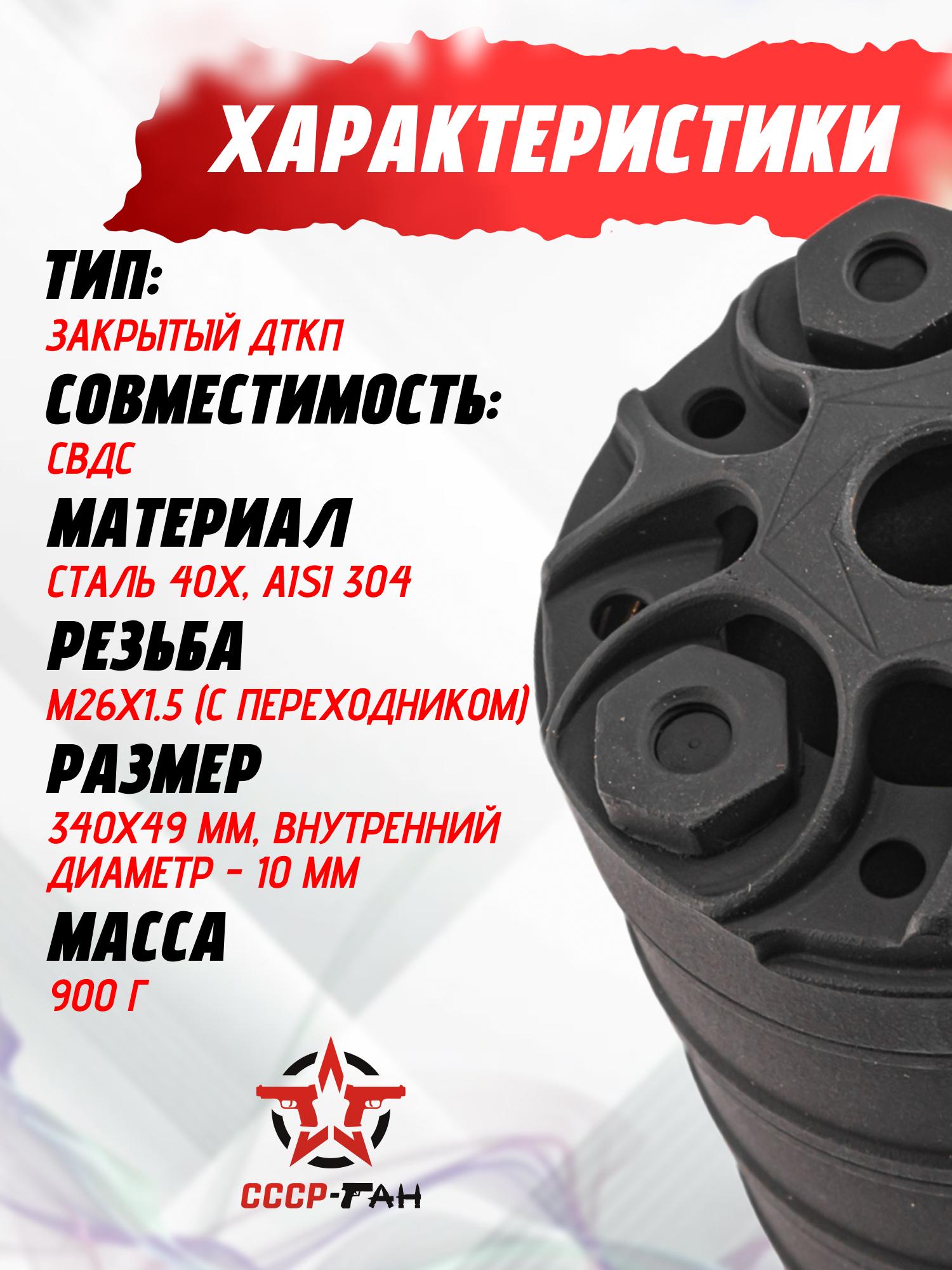 Этот образец изготовили под складную модель Драгунова - для установки СВД-С винтовка должна быть подготовлена путем демонтажа штатного пламегасителя. На его место ставится цанговый зажим - в свою очередь ДТКП накручивается на резьбу М26х1.5 адаптера. Такое крепление позволило обойтись без необходимости нарезания резьбы, что требовало бы обращения в специализированную мастерскую.