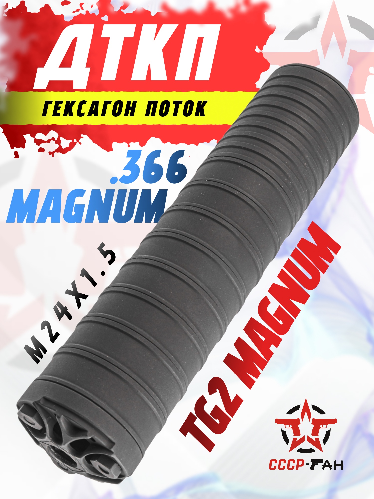 Рассматриваемый ДТКП Гексагон серии Поток проектировался инженерами специально для эксплуатации совместно с карабином TG2 .366 Magnum. Стандартные версии насадок не рассчитаны на нагрузку при эксплуатации отмеченного оружия, поэтому изготовитель выпустил модифицированную усиленную модель. Обновленная архитектура узла способна подавлять акустический импульс на значения порядка 25-30 Децибел.