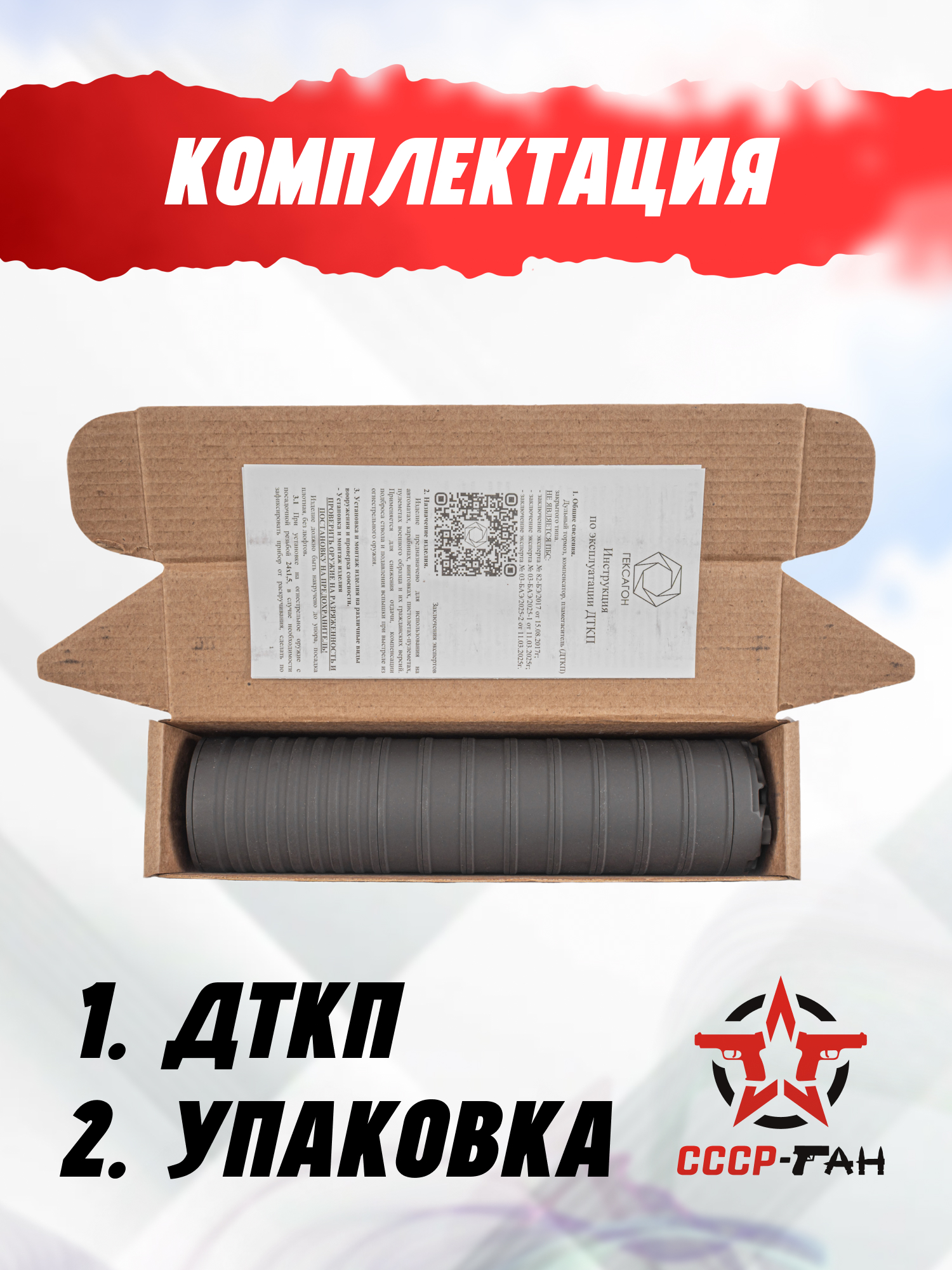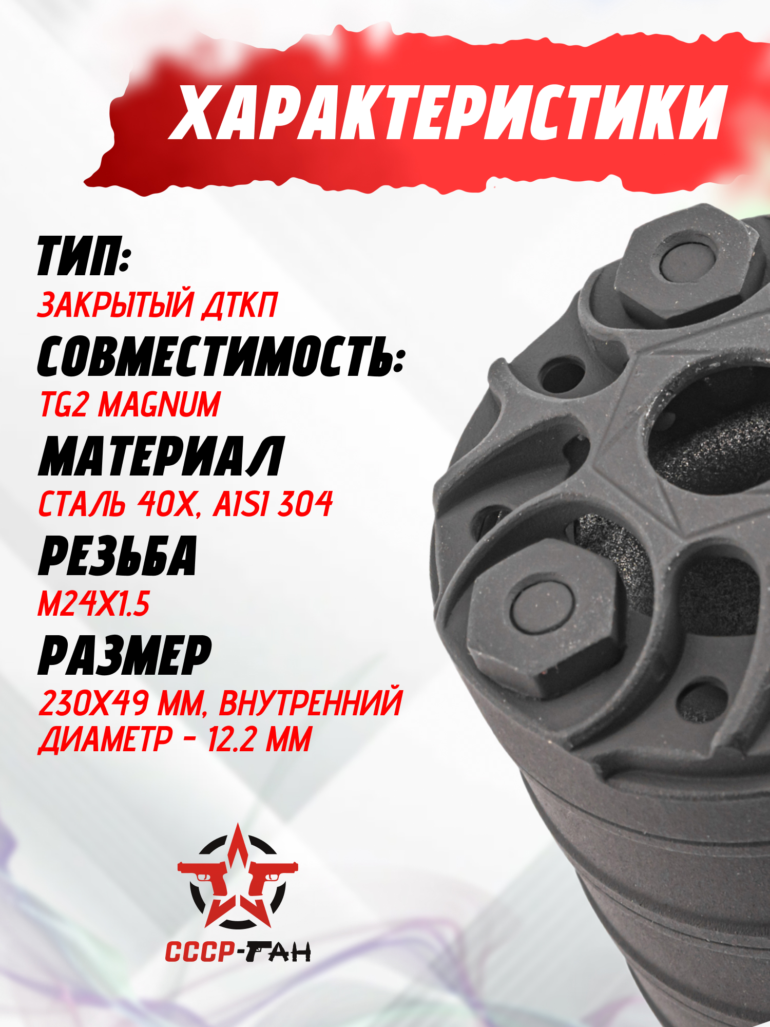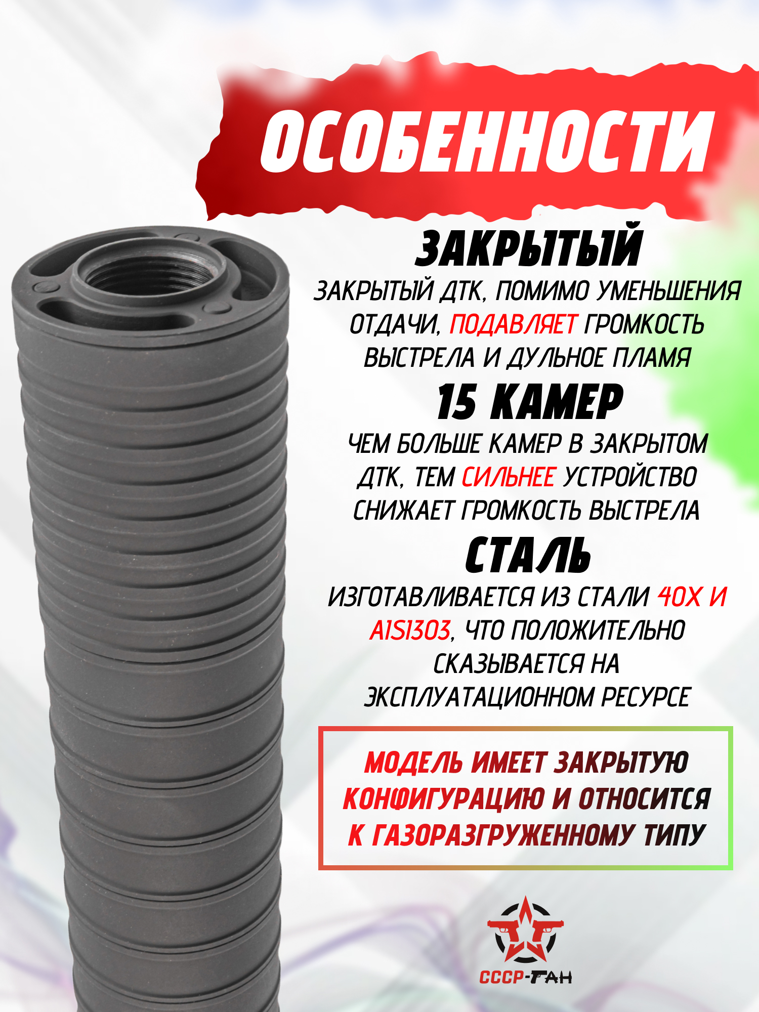 Гашение звука реализуется за счет внедрения многокамерного сепаратора во внутреннюю полость цилиндра, где продукты горения при стрельбе теряют начальную скорость и рассеиваются - диаметр пулепроходного канала в обозреваемом исполнении равняется 1.23 сантиметра. Поверхность изделия защищена специализированным термостойким составом Церта, гарантирующим сопротивляемость абразивному износу и температурным перепадам.