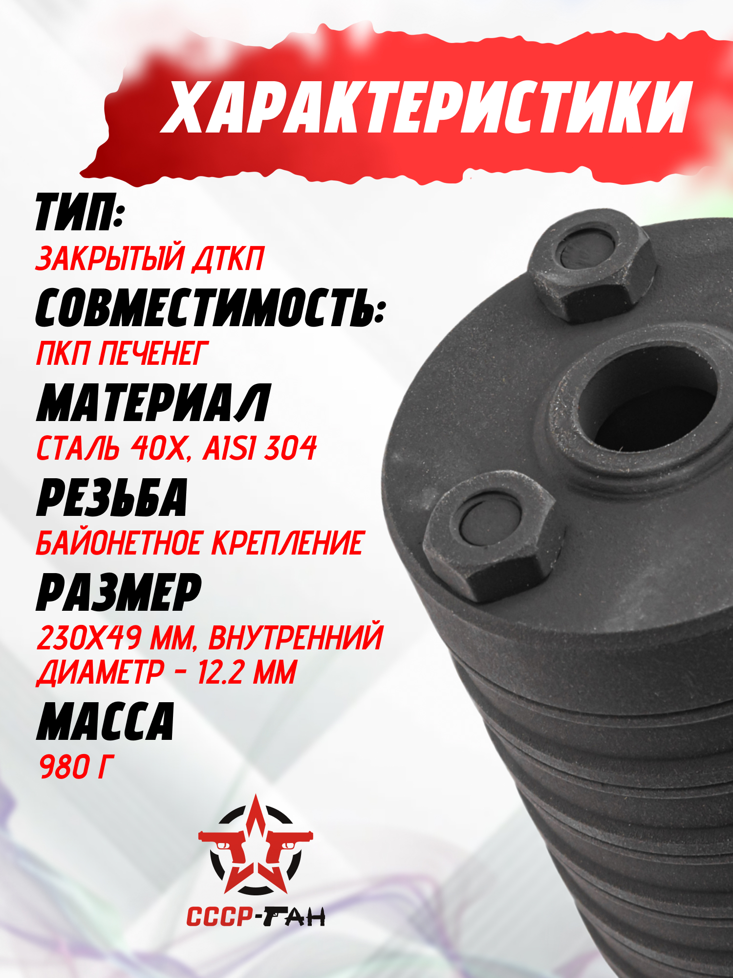 ДТКП под Печенег пулемет предполагает устранение вспышек и понижение уровня шума на 20-25 Децибел от изначального уровня, делая работу оператора оружия менее заметной для глаз и слуха противника. Кроме того, это снижает демаскирующие признаки и для цифровых приборов наблюдения, что актуально в текущих условиях применения ПКП калибра 7.62х54 мм. Конструкция предполагает наличие 10 камер, замедляющих скорость выхода газов, следующих за пулей.