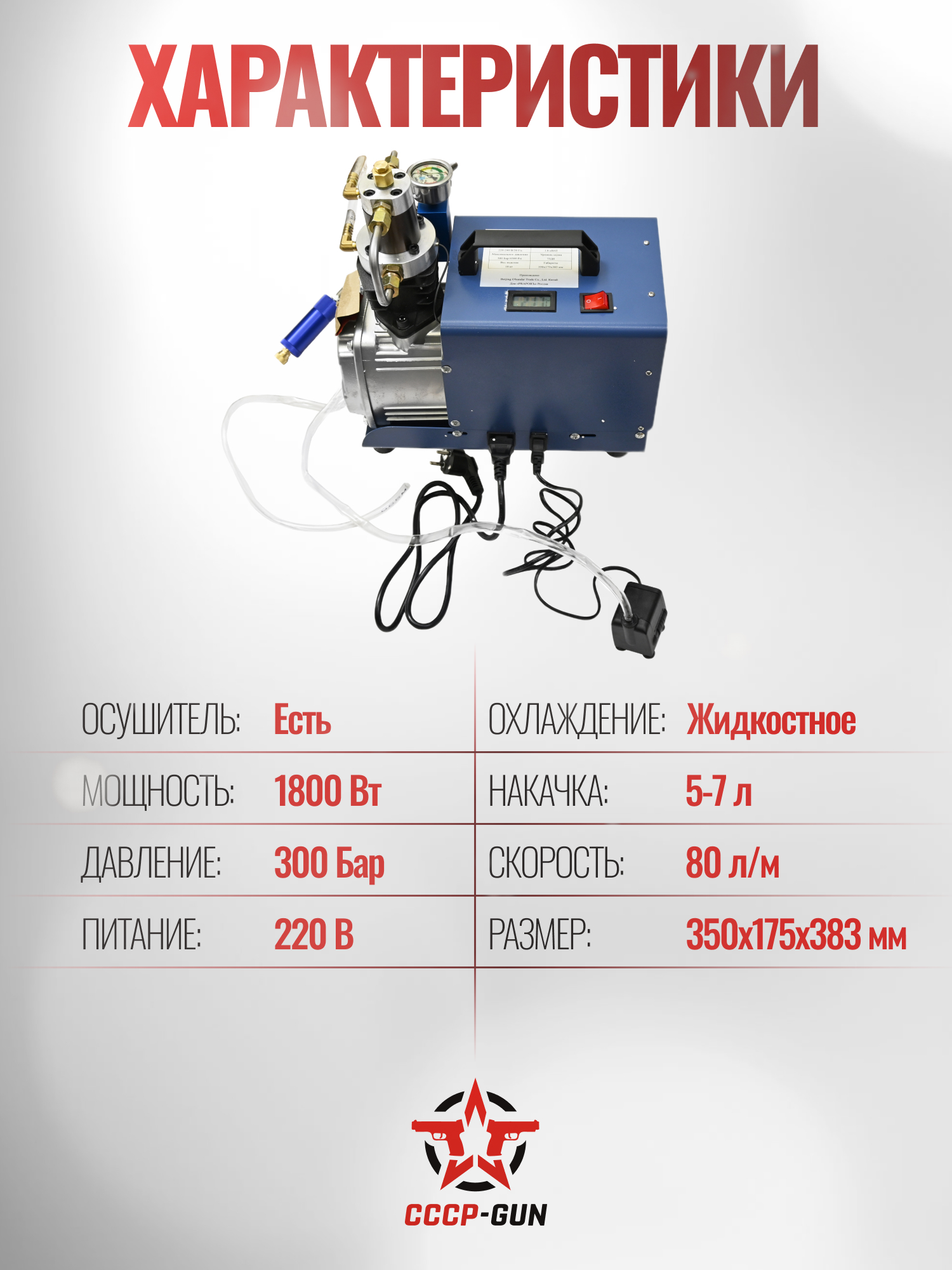 Охлаждение данной модели происходит за счёт внешнего источника воды. Говоря проще, перед запуском компрессора рядом с ним необходимо поместить ёмкость, объёмом в 6-7 литров, заполненную водой и провести в неё специальный шланг от компрессора.