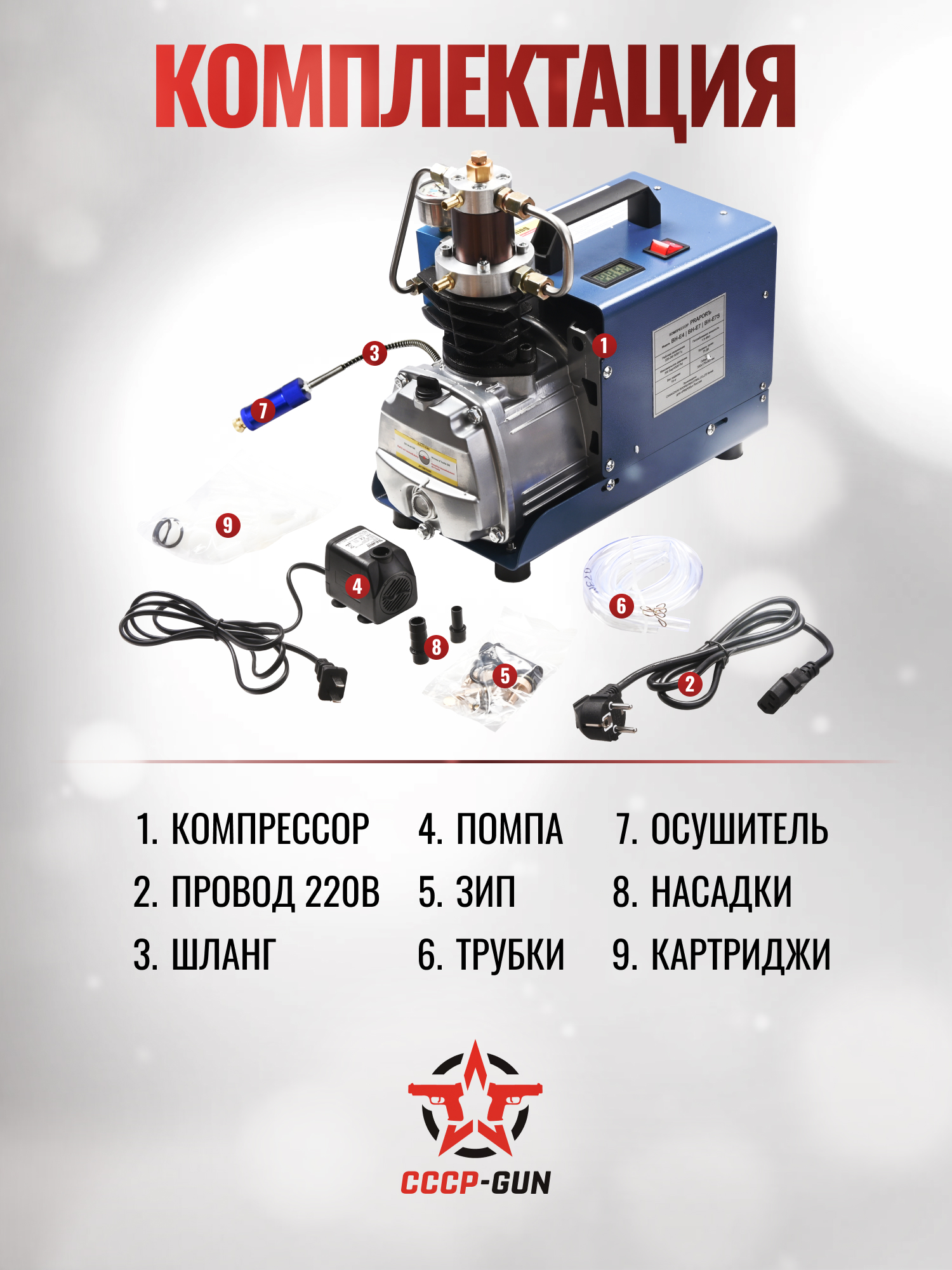 | Комплект поставки | Компрессор, насос водный, 2 шланга для насоса, упаковка, масленая пробка со сбросом давления, Комплект уплотнительных и осушительных элементов |