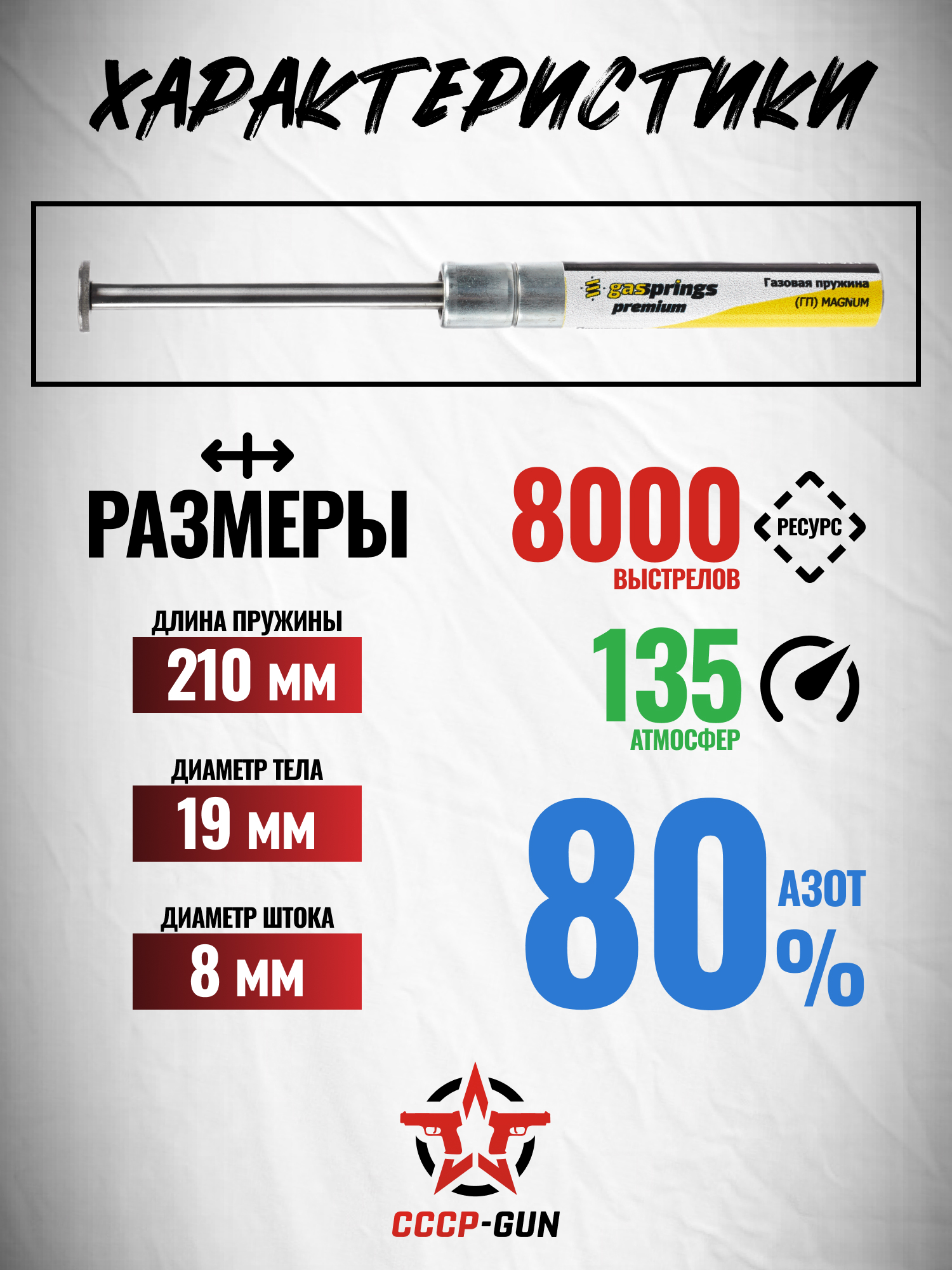 Корпусная часть газовой пружины изготавливается из высокопрочного металлического сплава, внутренняя часть заполняется 80-процентным азотом - стабильное функционирование гарантируется приблизительно в течение 8 тысяч выстрелов. Установка ГП положительно влияет на ресурс внутренних компонентов оружия ввиду уменьшения вибраций после выстрела, что также позволяет пользователю обращаться к чувствительной оптике.