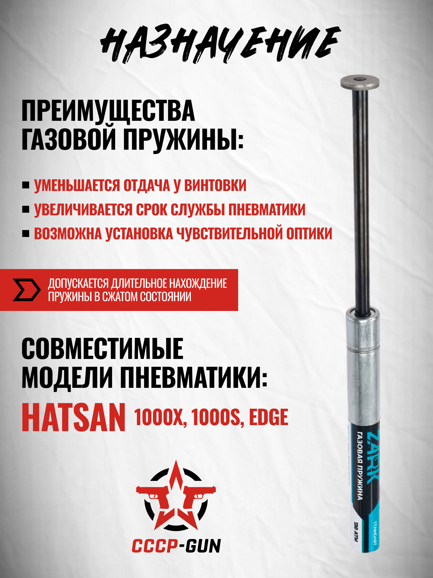 Газовая пружина Зарк Стандарт 130 Атм предназначена для монтажа в турецкую пневматику Hatsan Edge, 1000X и 1000S. Изделие имеет полную совместимость с платформами и не требует их серьезных доработок.