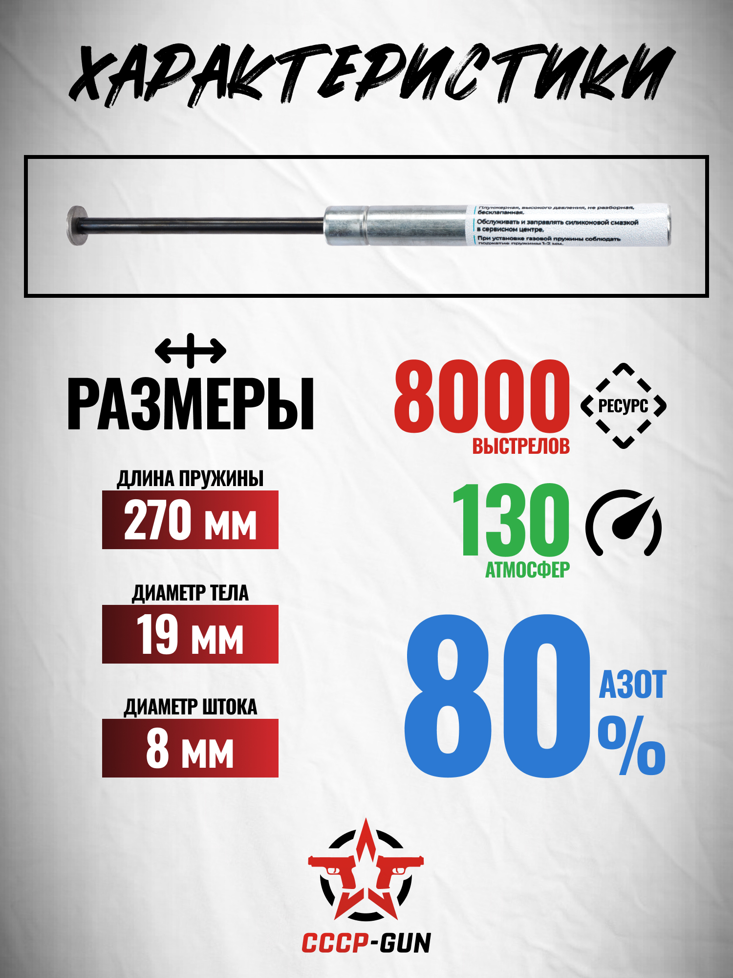 Рассматриваемый экземпляр - высокоэнергетичная альтернатива витым пружинам, работающая за счет сжатого азота под давлением в 130 Атмосфер. Изделие в полной мере герметично и надолго сохраняет рабочие свойства после корректного монтажа.
