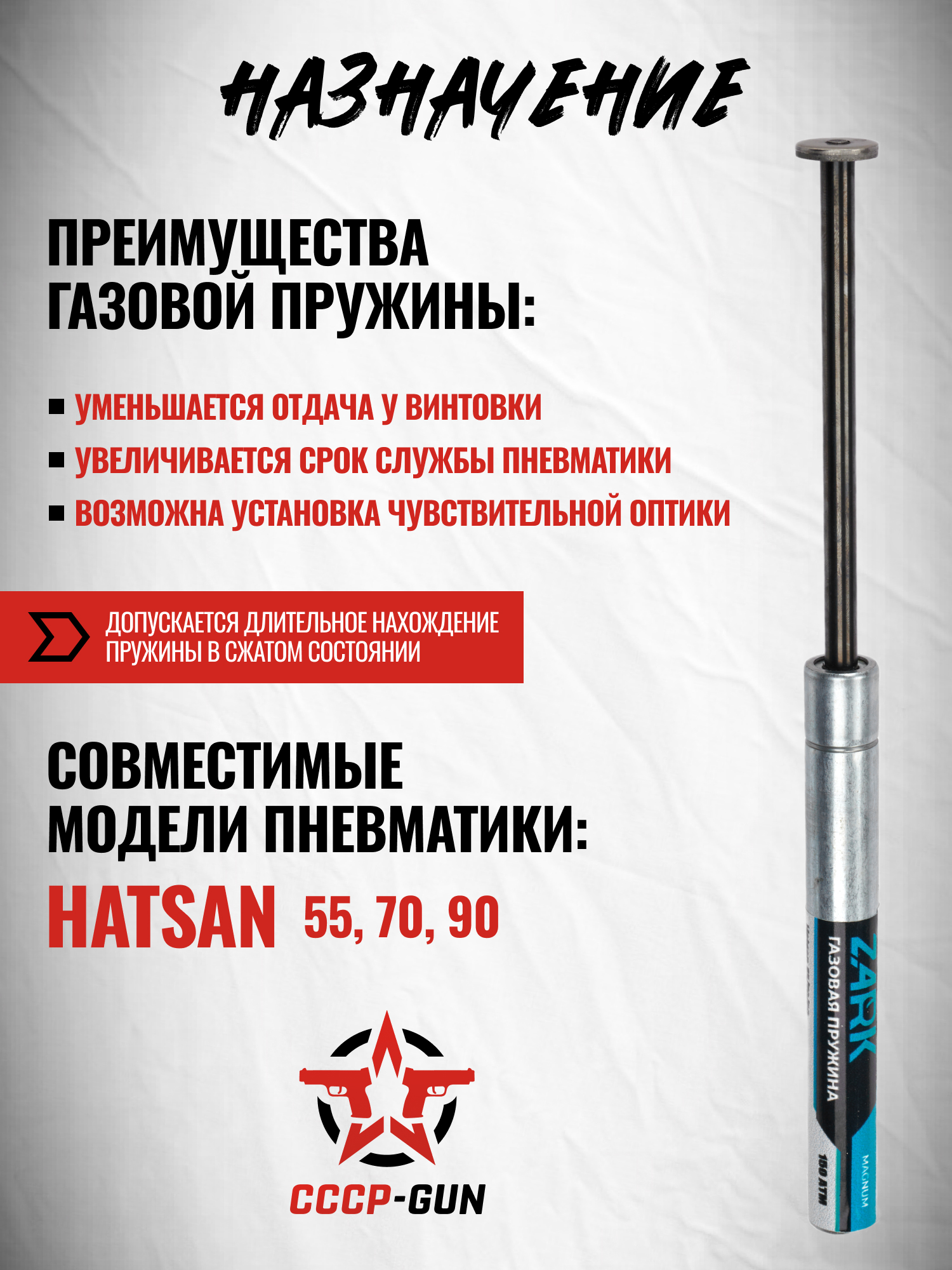 Газовая пружина на винтовку Хатсан от Зарк наделена ресурсом до 10000 выстрелов. Экземпляр снижает износ узлов платформы. Это увеличивает срок эксплуатации как ее самой, так и закрепленной на ней оптики.