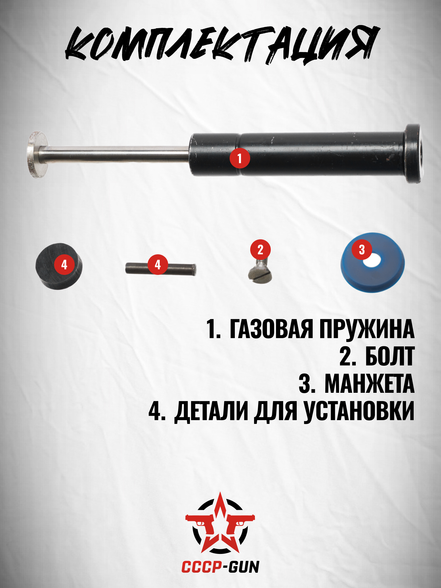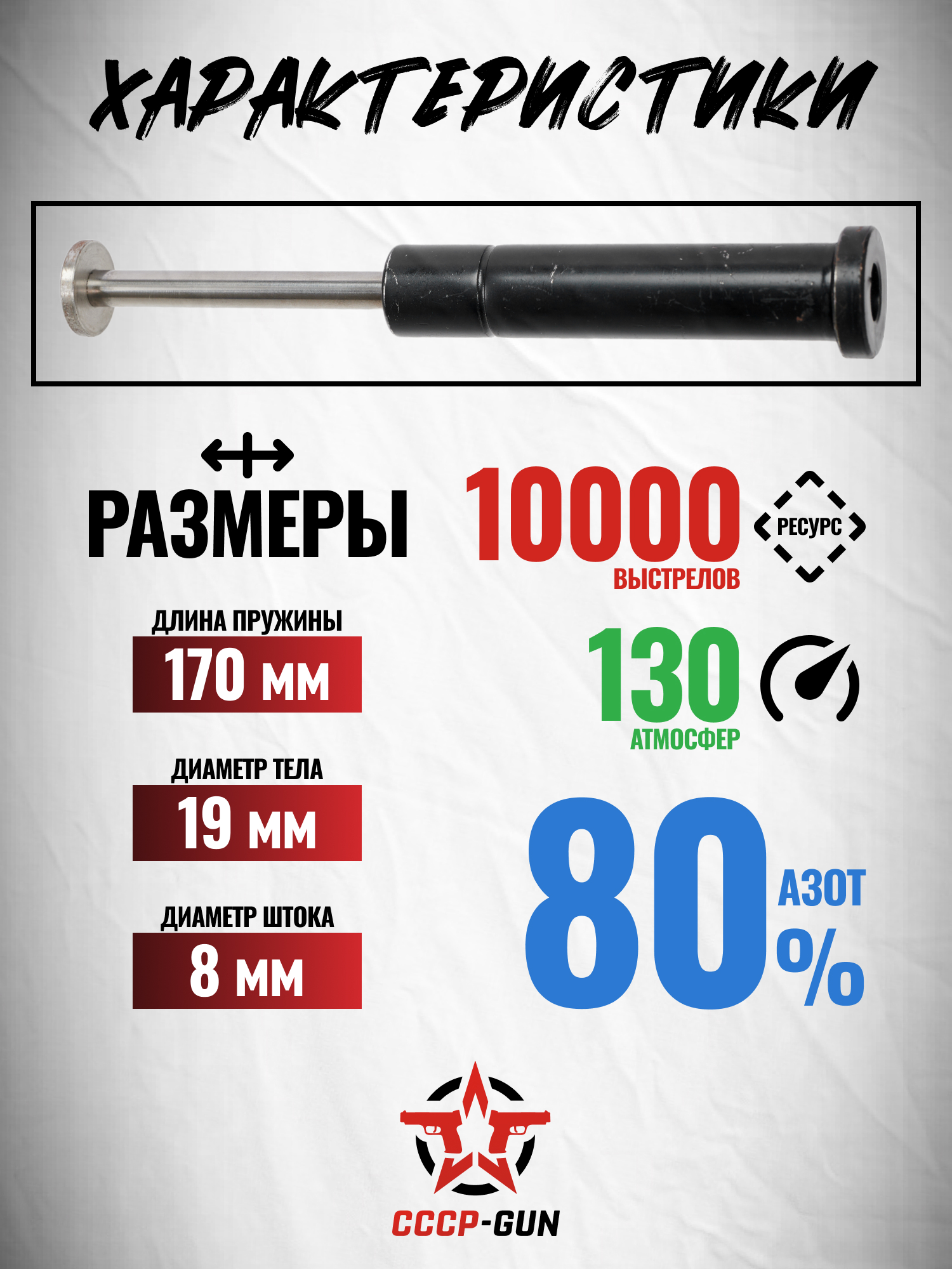 Длина модели составляет 170 мм, габарит штока - 120 мм, модернизация происходит без серьезных вмешательств в узлы платформы. Возможна самостоятельная установка при наличии навыков работы с пневматическим оружием и соответствующего набора инструментов.