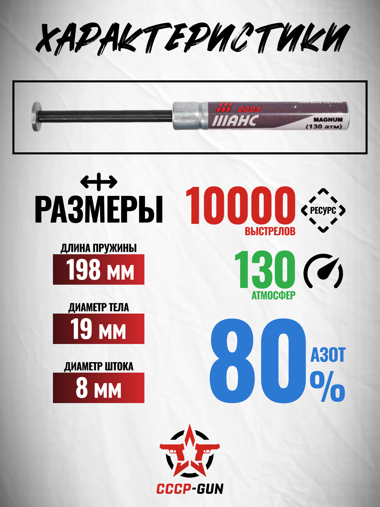 Производитель Шанс специализируется на создании комплектующих для модернизации пневматического оружия, предлагая стрелкам надежные решения. Газовые пружины этого бренда сочетают легкость установки и совместимость с различными моделями винтовок. Таким изделием в линейке является Магнум.