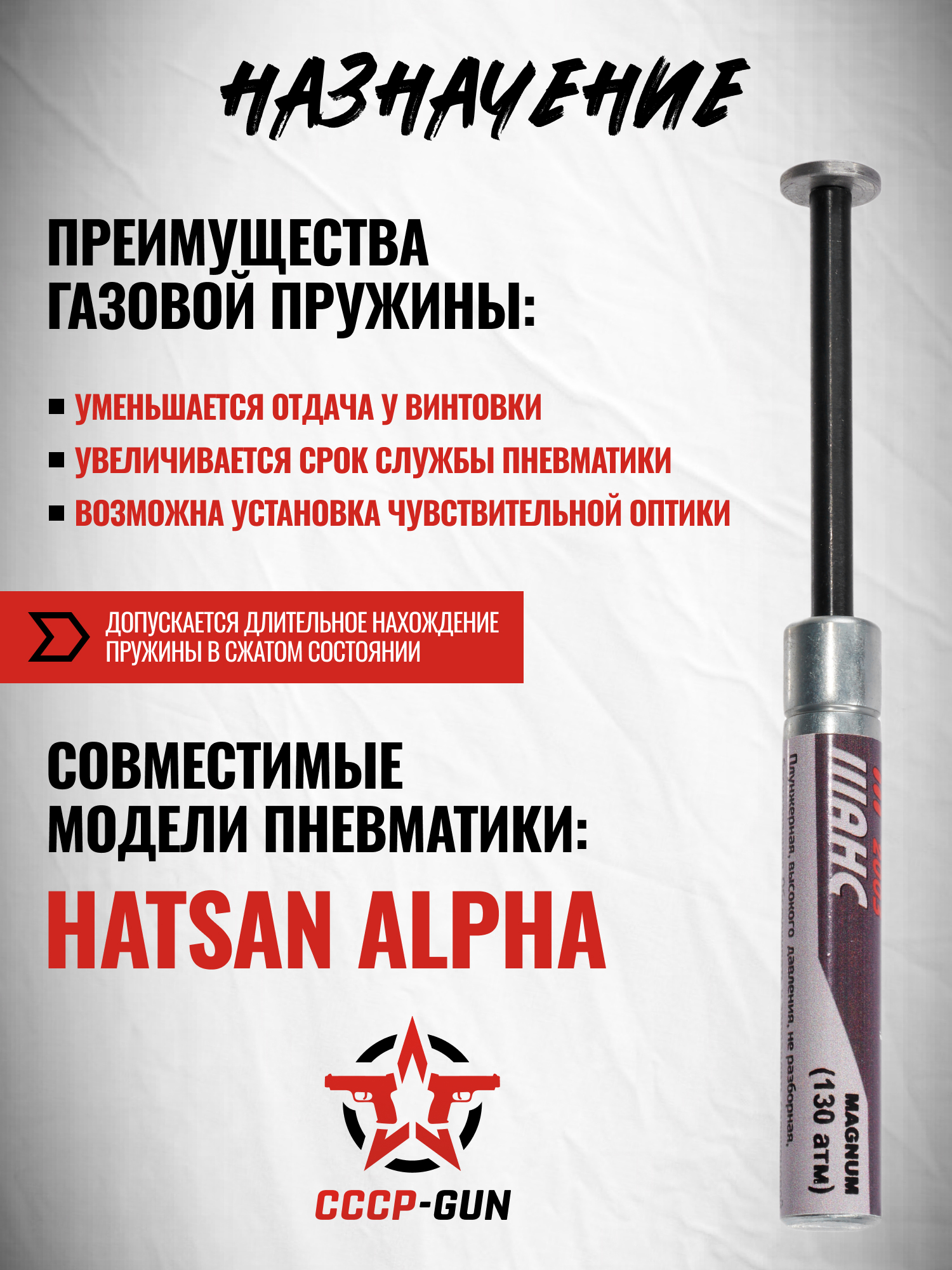 Пружина устанавливается в популярнейшую турецкую винтовку Hatsan Alpha. Архитектура конструкции дает заменить механизм без вмешательства в узлы платформы.