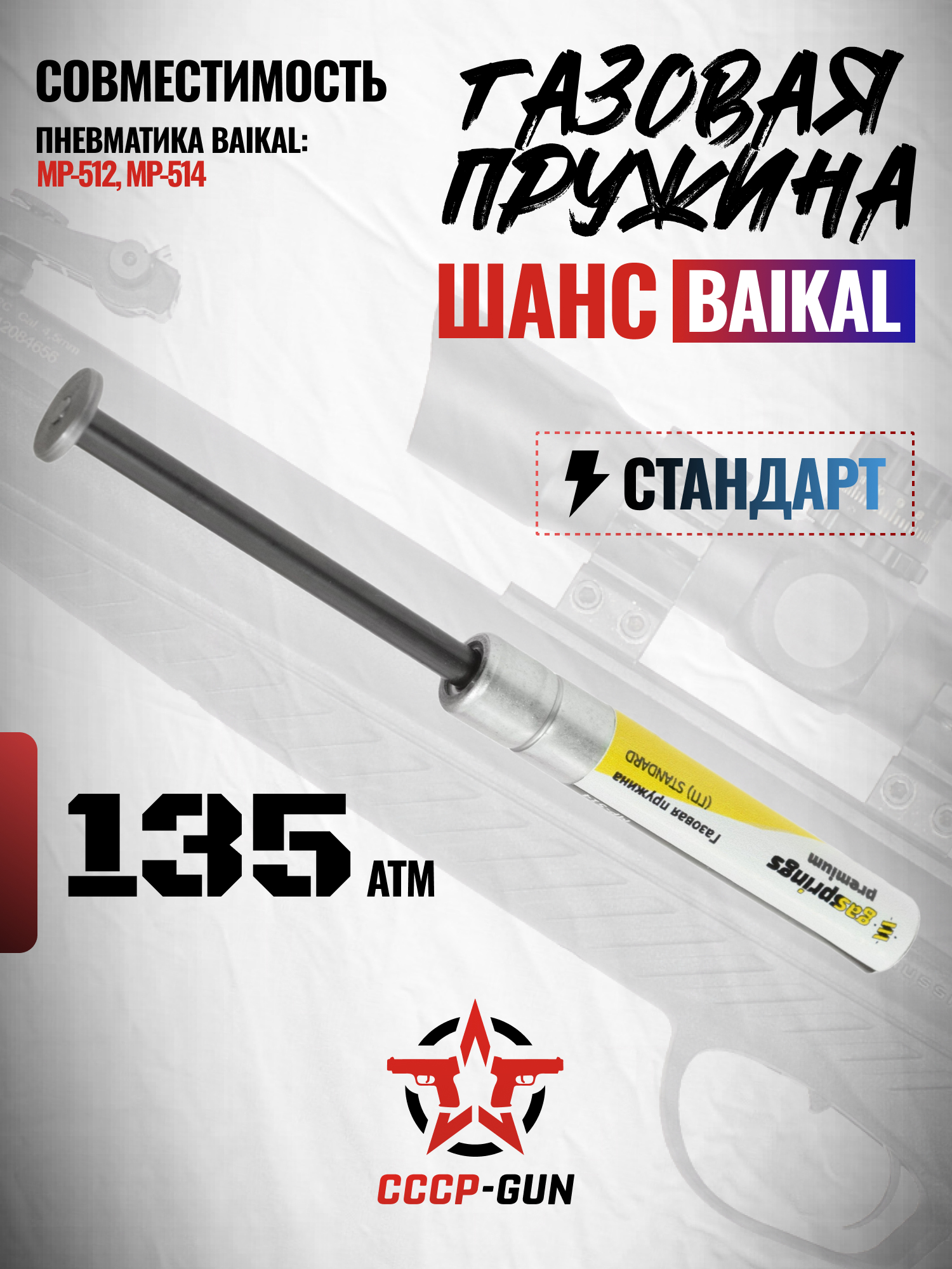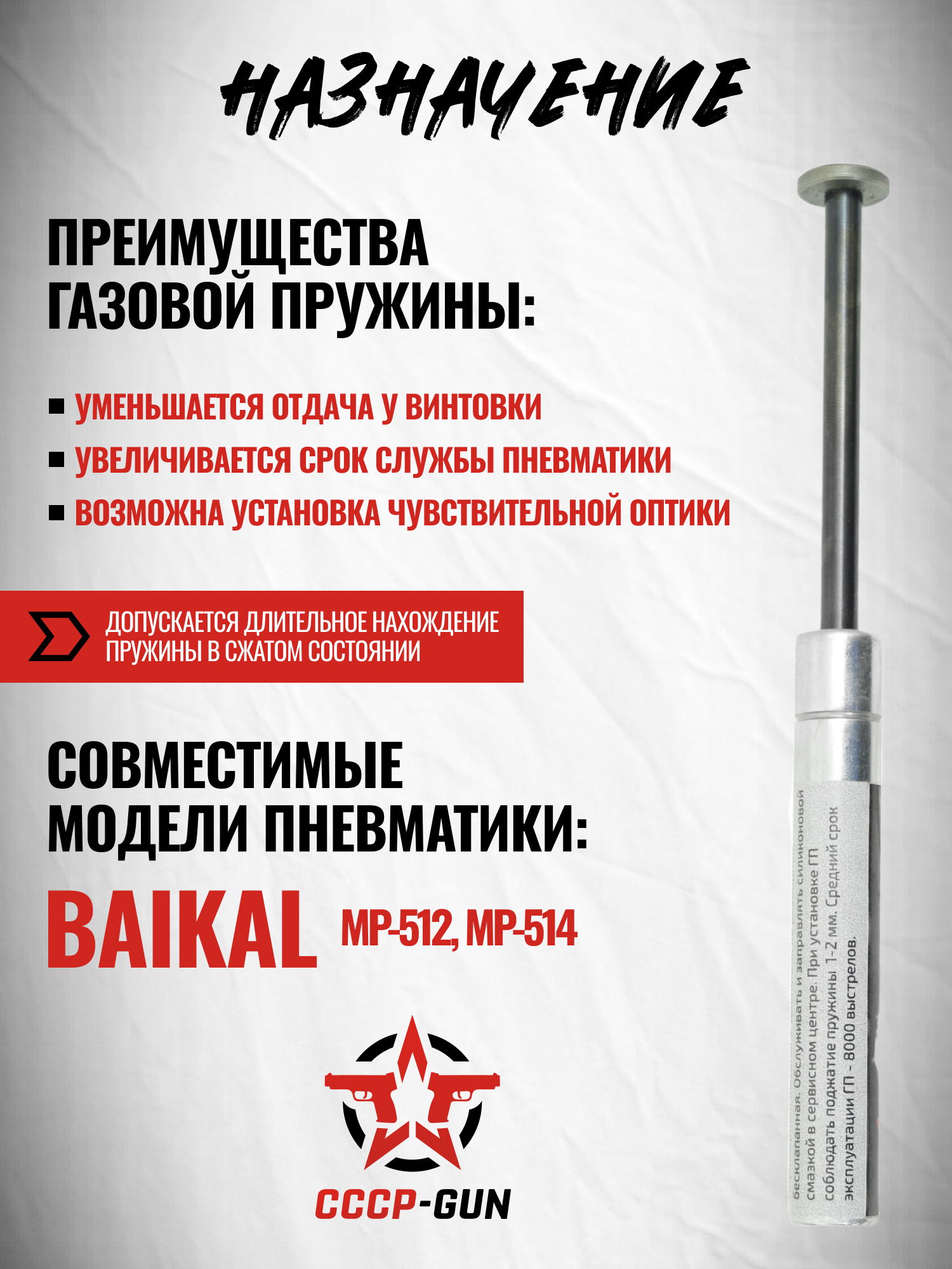 Модель полностью совместима с пневматическими винтовками МР-512 и МР-514, не требует вмешательства в конструкцию платформ и устанавливается в стандартный посадочный канал штоком в задник. Также необходима процедура поджатия на 2-3 мм. После замены классической пружины на газовую снижается уровень вибраций, пропадает характерный звук, а сам процесс взвода становится мягче и тише.