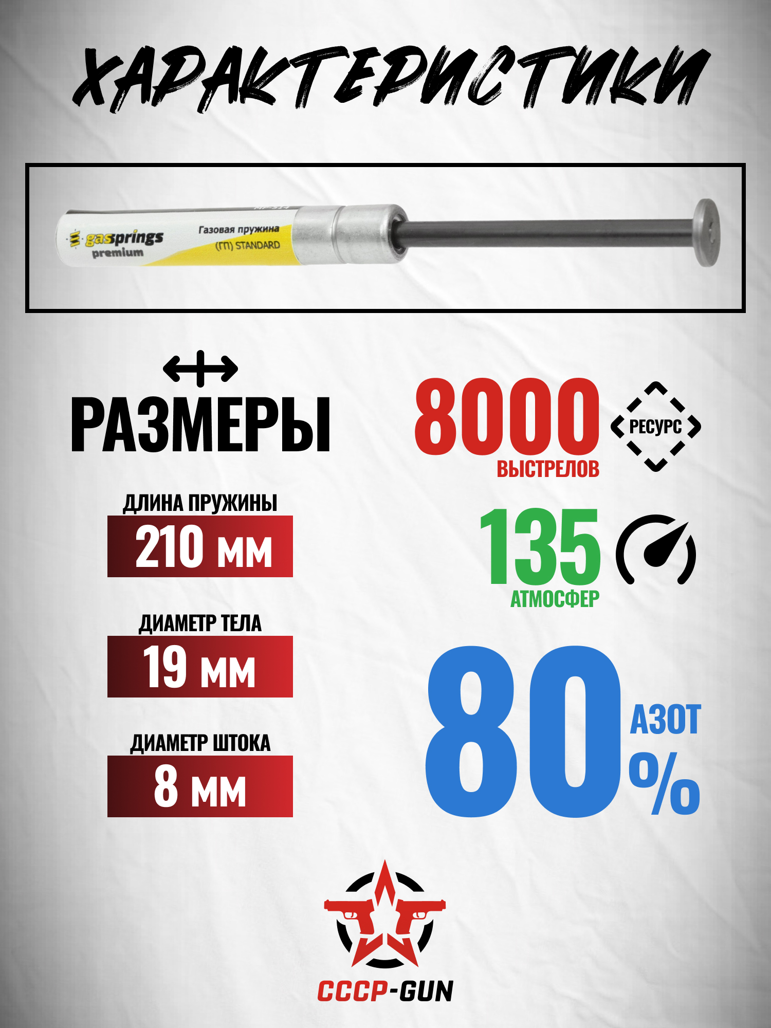 Пружина заправлена азотом под давлением в 135 Атмосфер, что обеспечивает повышенную начальную скорость боеприпаса. Корпус изделия герметичен и не требует техобслуживания, в отличие от металлических аналогов.