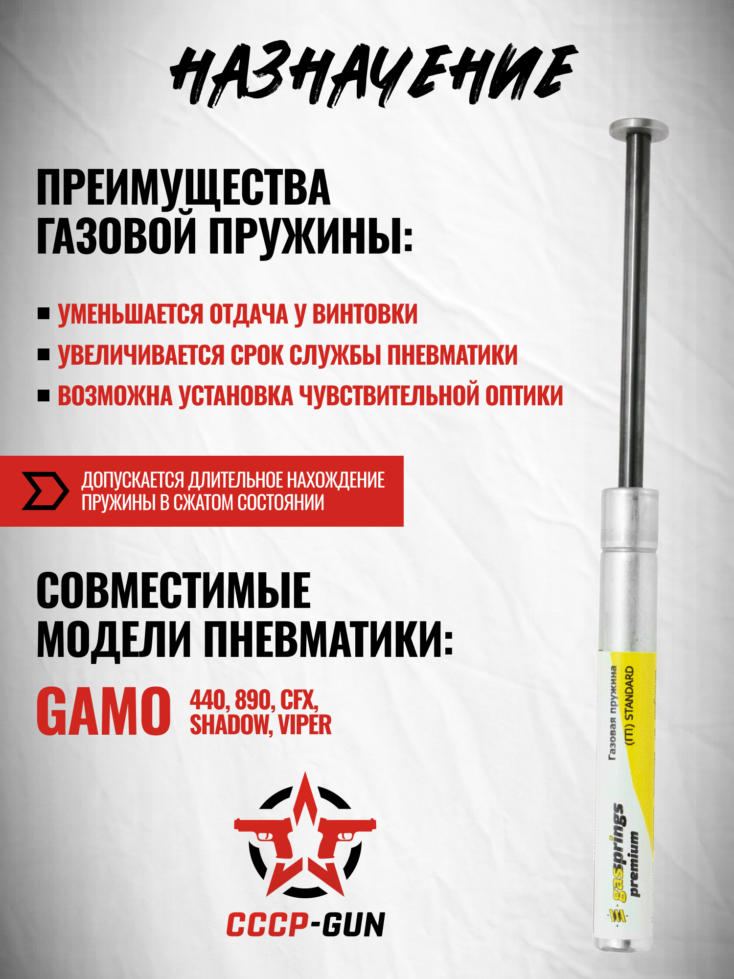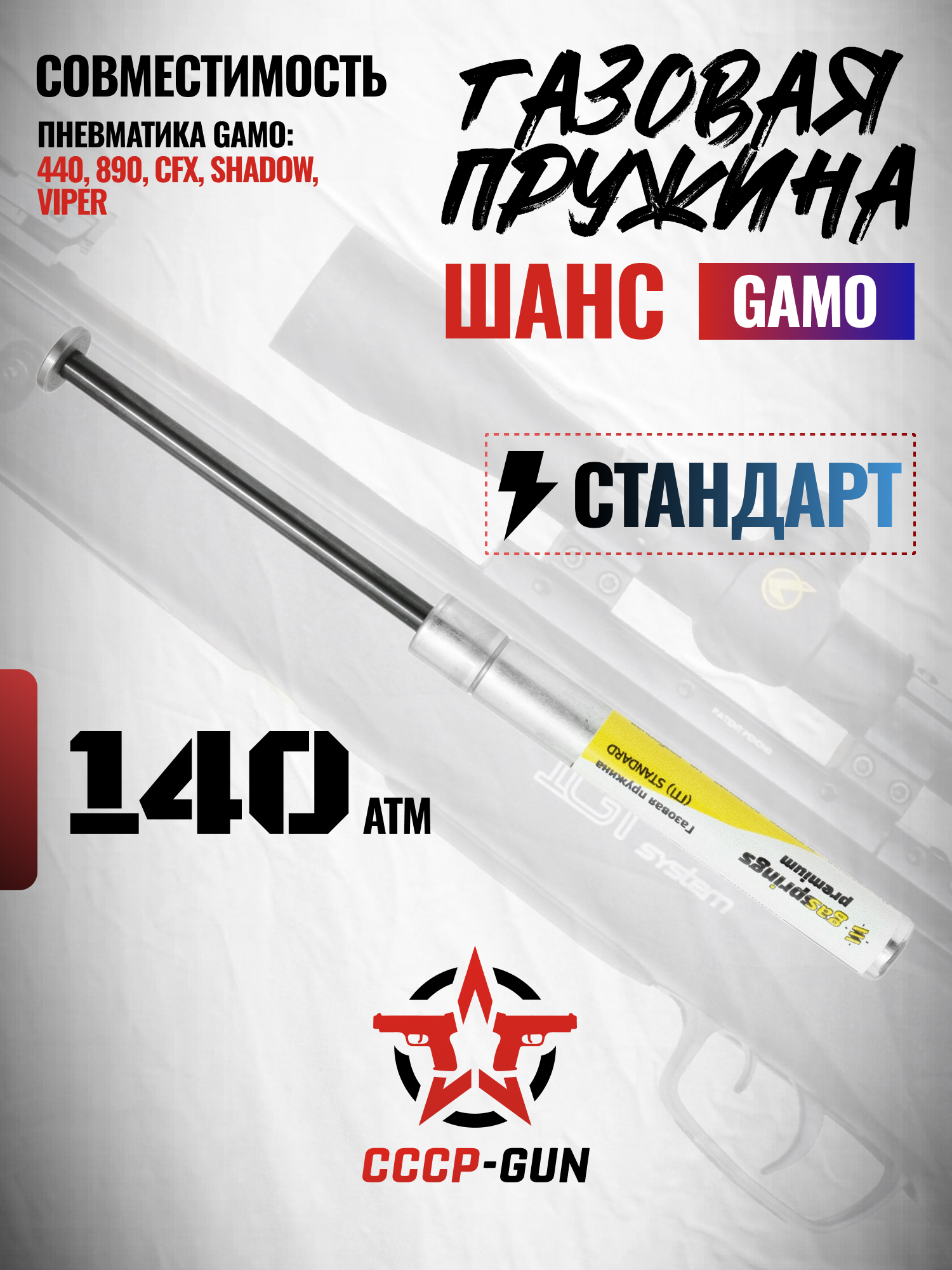 Компания Шанс специализируется на выпуске комплектующих для модернизации пневматического оружия, делая акцент на надежности, ресурсе и совместимости с популярными моделями. Газовые пружины этого производителя известны благодаря качественной сборке и легкой установке. Среди них - рассматриваемое изделие для винтовок Gamo.