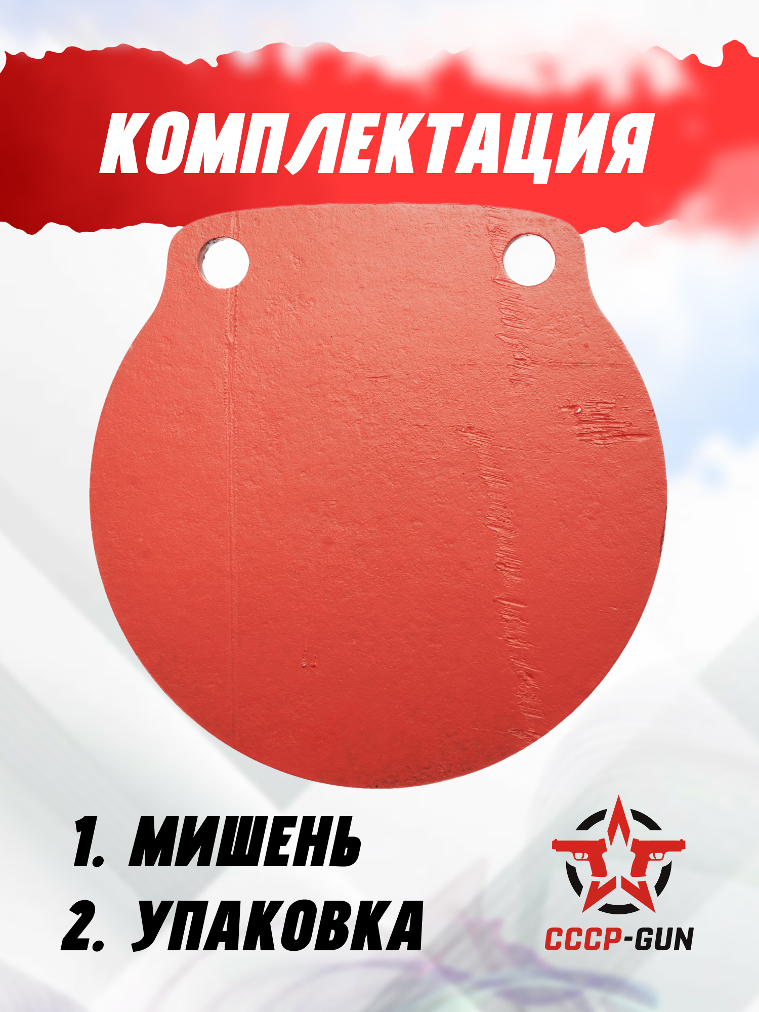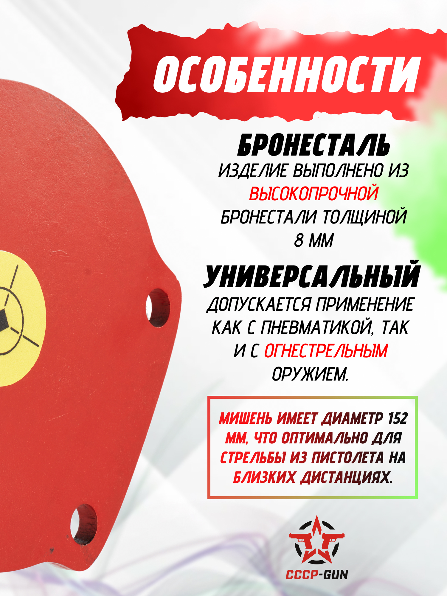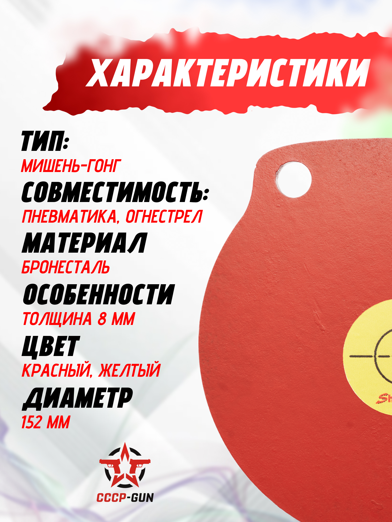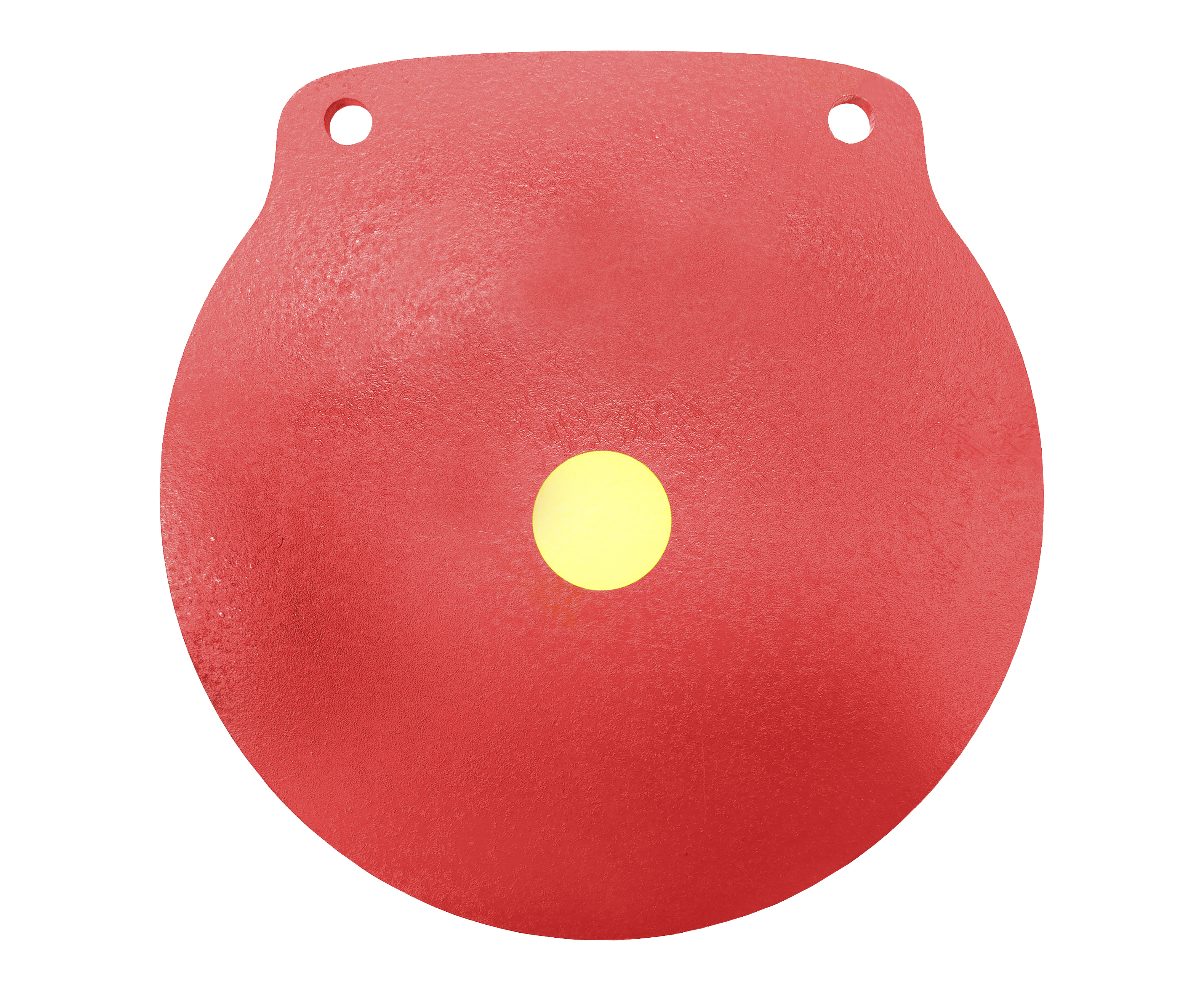 Диаметр диска при весе 1.2 кг составляет 152 мм. Поверхность выполнена в красном цвете, центр украшает контрастная желтая точка для облегчения прицеливания на средних и больших дистанциях выстрела. Металлическая основа имеет диаметр 8 миллиметров, что делает мишень подходящей для оружия разного калибра.