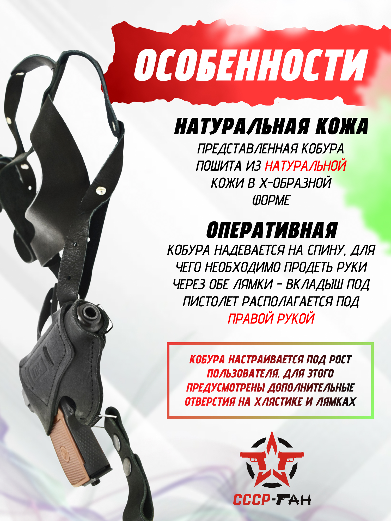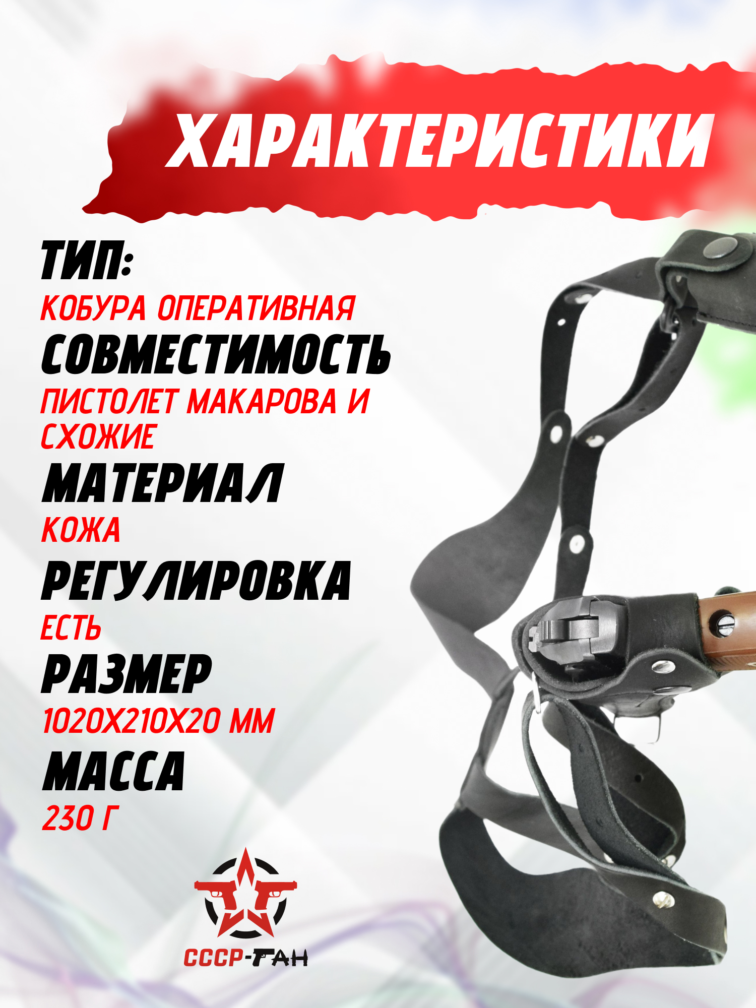 | Тип | Оперативная кобура (Х-образная, имеется ниша под дополнительный магазин) |