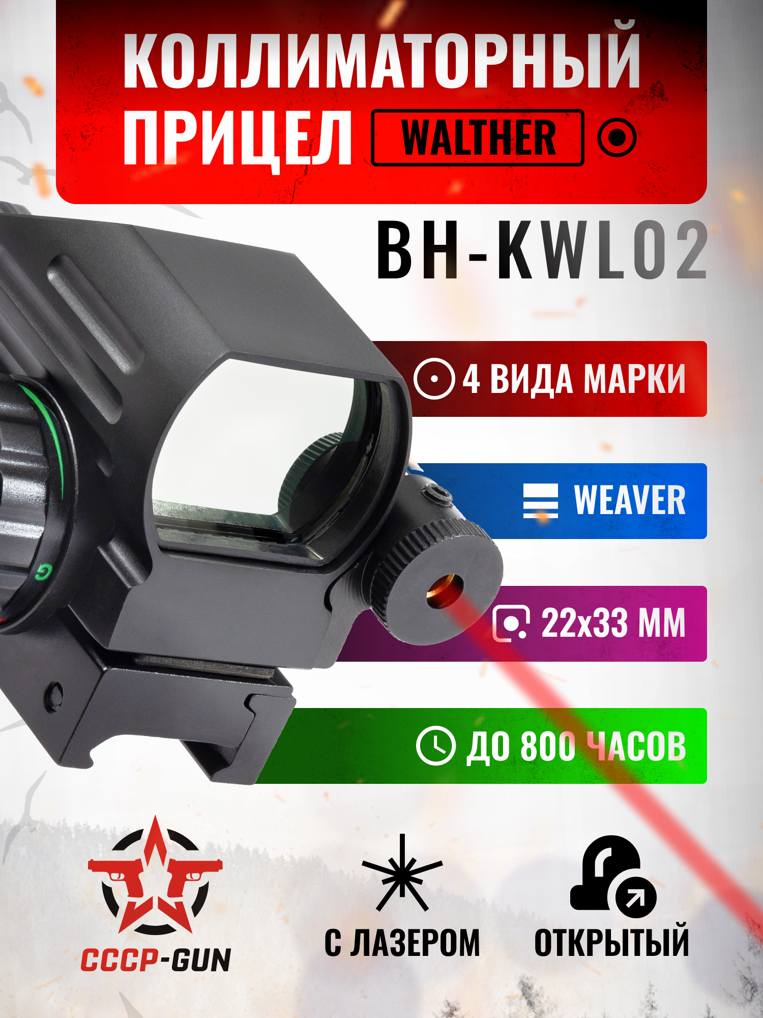 Коллиматорный прицел, изготовленный под немецкой торговой маркой Walther в Китае. Модель интересна в первую очередь тем, что на коллематорном прицеле установлен лазерный целеуказатель.