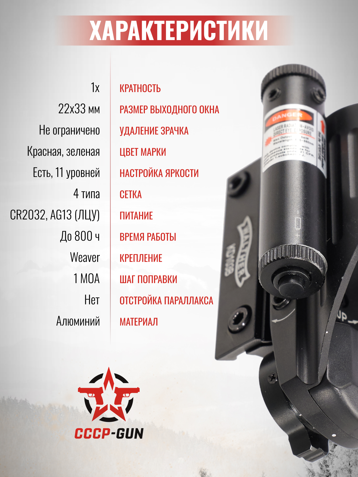 Итак, коллиматорный прицел Вальтер 103 с ЛЦУ обеспечит максимально высокие показатели кучности и точности стрельбы на ближние дистанции. Модель объединяет в себе простоту эксплуатации и качество изготовления.