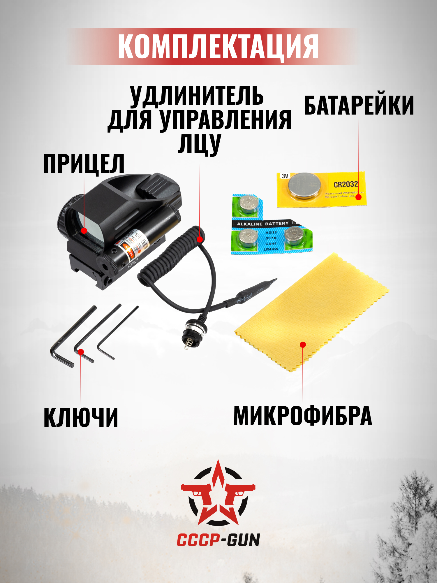 В комплекте с прицелом поставляется ЛЦУ, провод для его дистанционного включения, два вида батареек, инструкция, шестигранный ключ, а так же салфетка из микрофибры.
