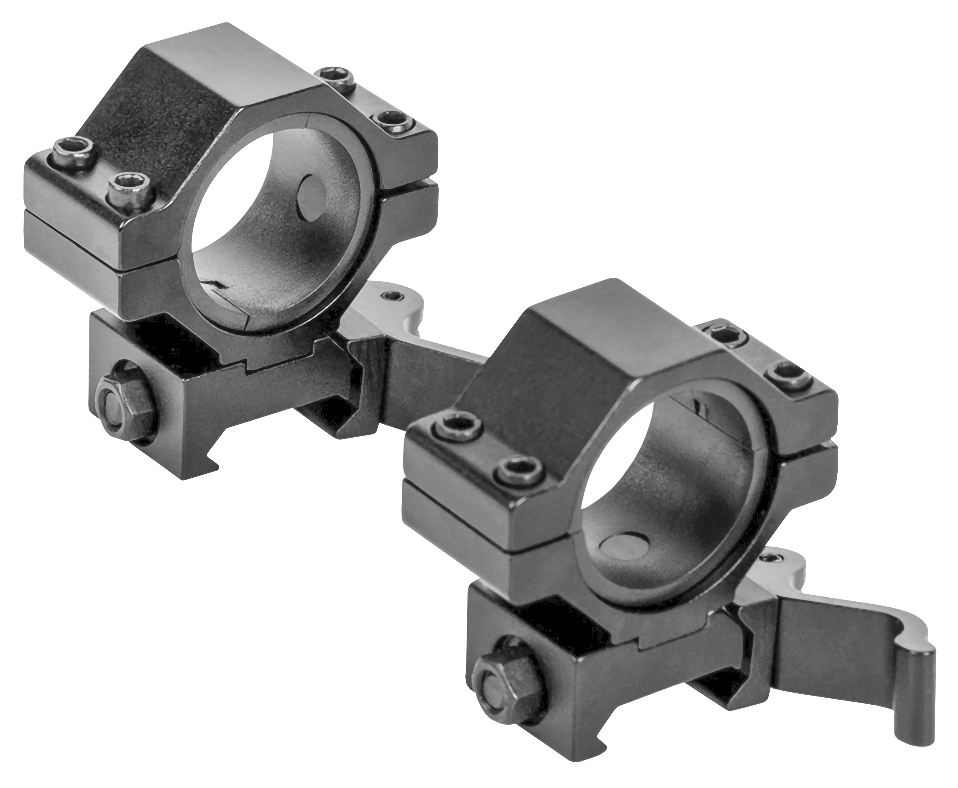 Представленный набор из двух колец относится к представленной категории креплений - в этом случае за фиксацию отвечает специальный рычаг, который можно открыть вручную. Адаптация изделий к планке осуществляется посредством вращения рычага вокруг своей оси - затяжка позволит кольцам жестче размещаться на рельсе. Непосредственно прицел прижимается к основанию полукольцами, каждое из которых держится на 4-х винтах - внутренний диаметр рассматриваемых образцов равен 30 мм.