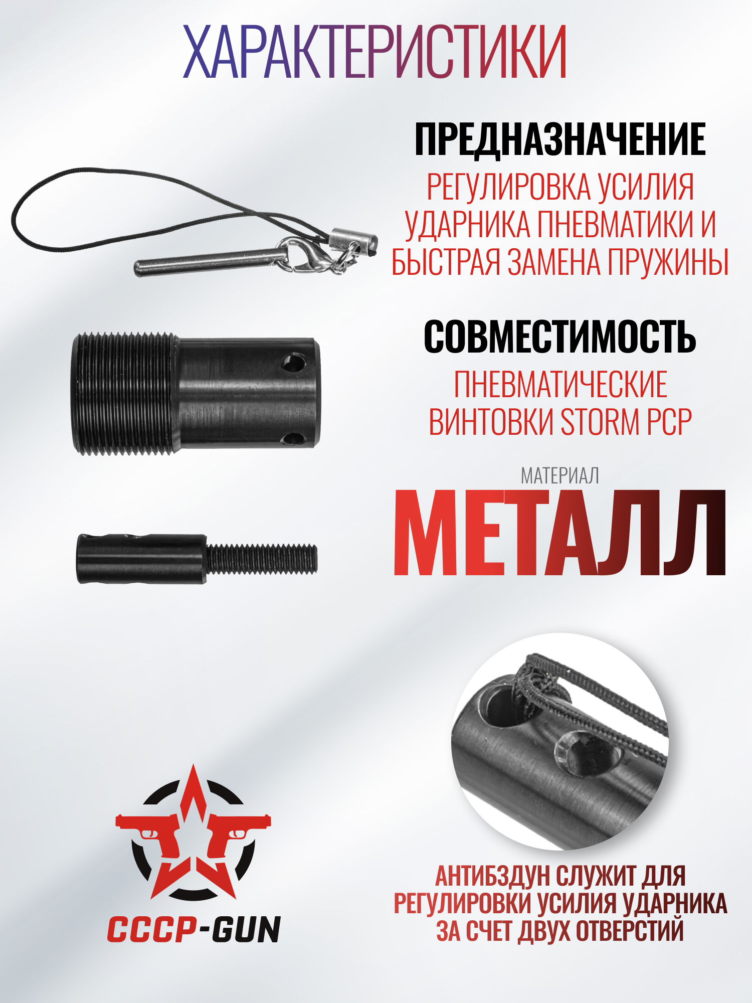 Обозреваемый комплекс деталей также образует механизм оперативной настройки уровня усилие, которое развивает ударник при взаимодействии с клапаном. Такой функционал поможет пользователю быстро перестроить винтовку под иную массу пуль. Для этого можно воспользоваться как путем вращения части, удлиняющей шахту ударника, так и отверстиями в направляющей.