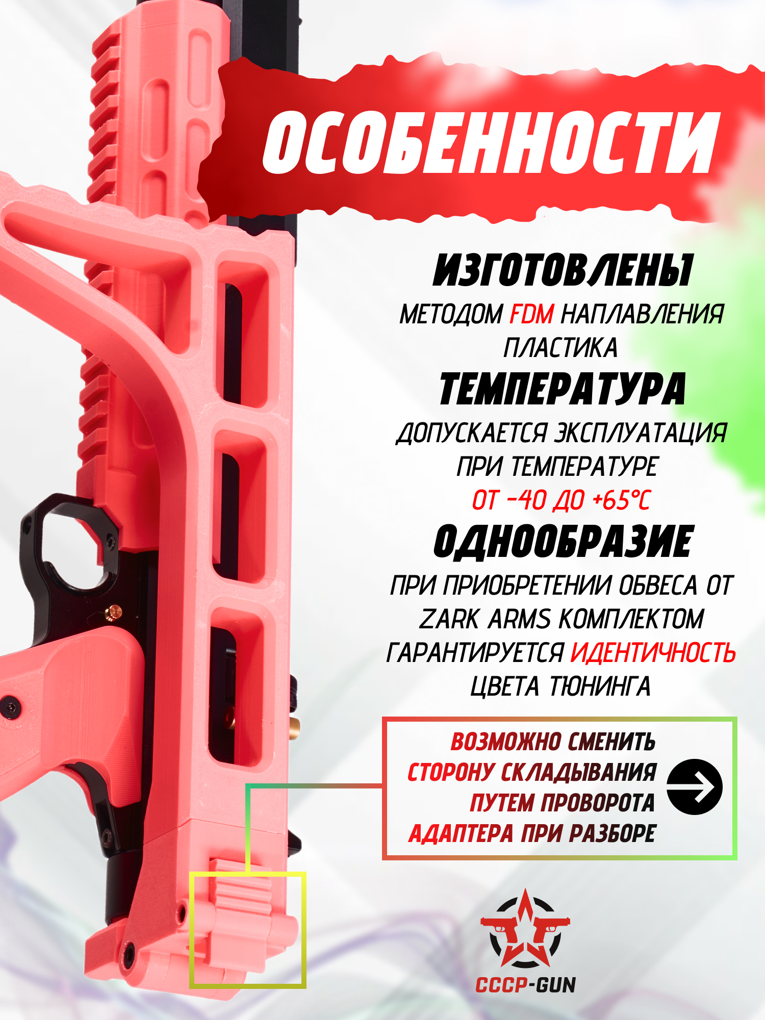 | Особенности конструкции | 3D печать методом FDM наплавления, эксплуатационная температура: от -40 до + 65°C, планка Weaver 22 мм на монолитном цевье, возможность смены стороны складывания приклада |