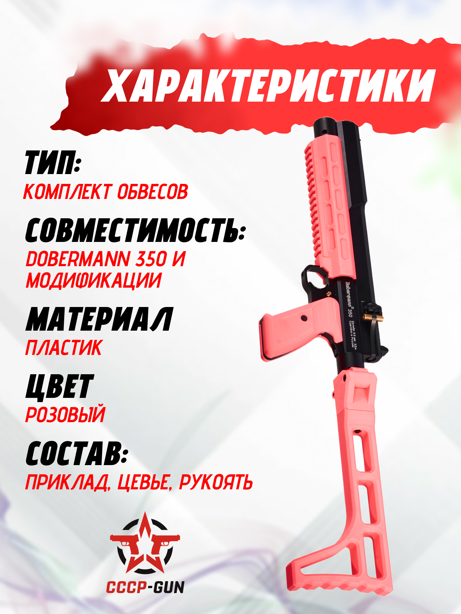Оружейный тюнинг Zark Arms для Dobermann 350 - это набор обвесов, который включает в себя складной приклад, тактическое цевье и рукоять. Пластиковые детали выполнены в розовом цвете, и подобраны в тон друг друга, что исключает покупку элементов с отличающимся оттенком. Полимер, из которого создан обвес, выдерживает температурный диапазон от -40 до +65 градусов.