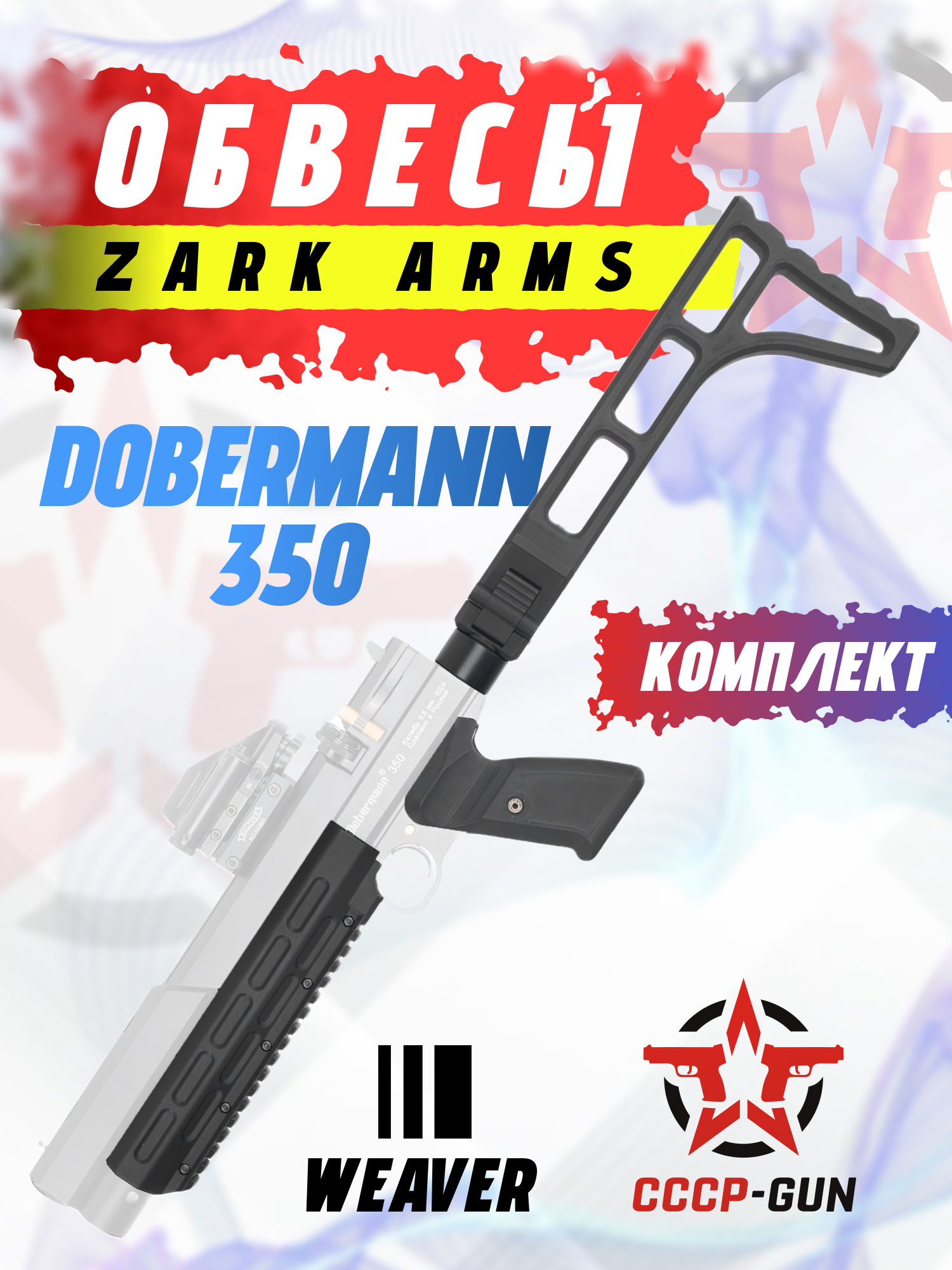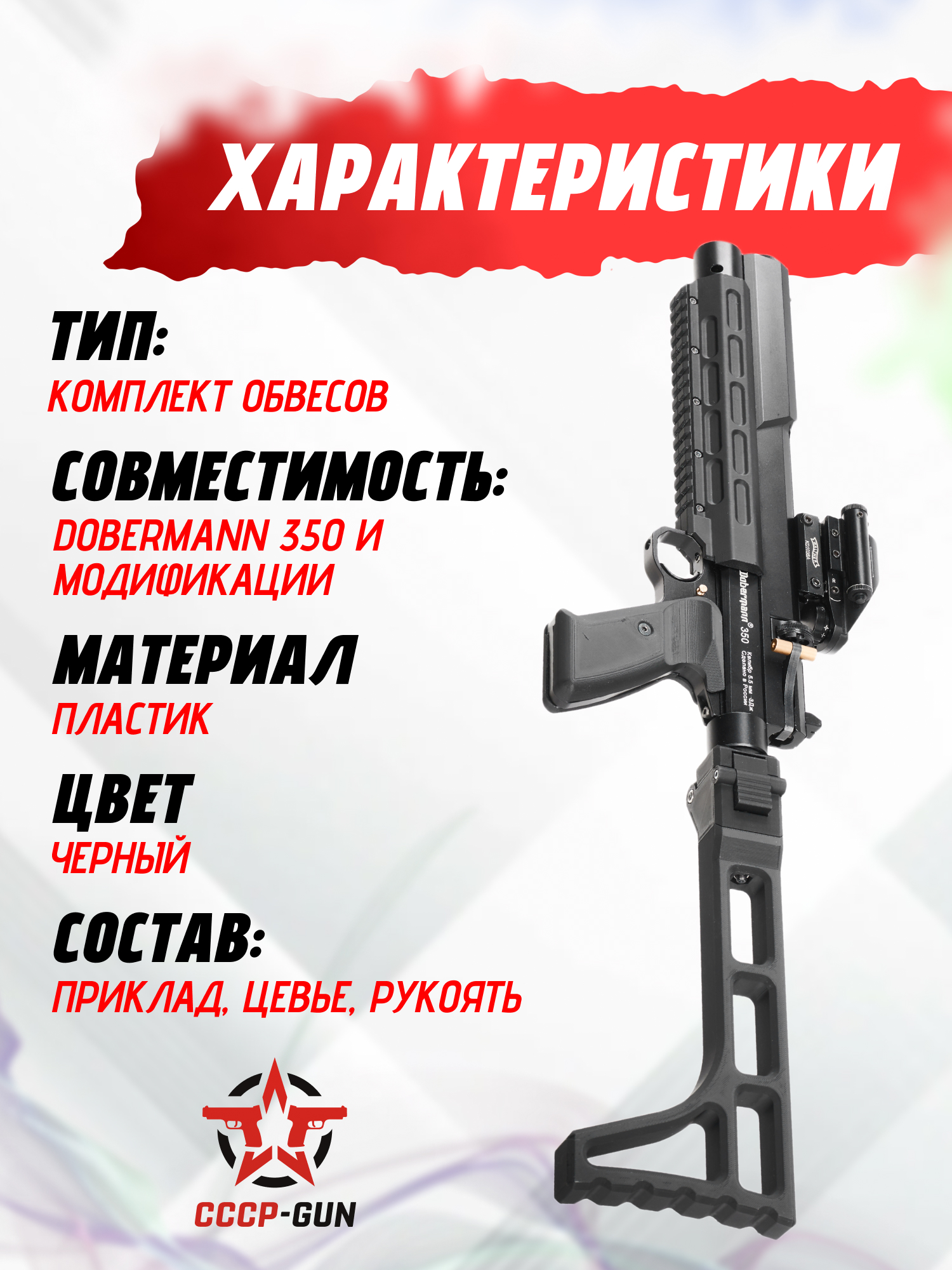 Тюнинг комплект Zark Arms на Dobermann 350 состоит из тактического цевья, складного приклада и рукояти. Изготавливаются перечисленные элементы путем наслаивания расплавленной полимерной нити, которая после остывания выдерживает диапазон температур от -40 до +65 градусов. Конечная обработка подразумевает возможность наличия малых следов экструзии, не снижающих удобство при работе с обвесом.