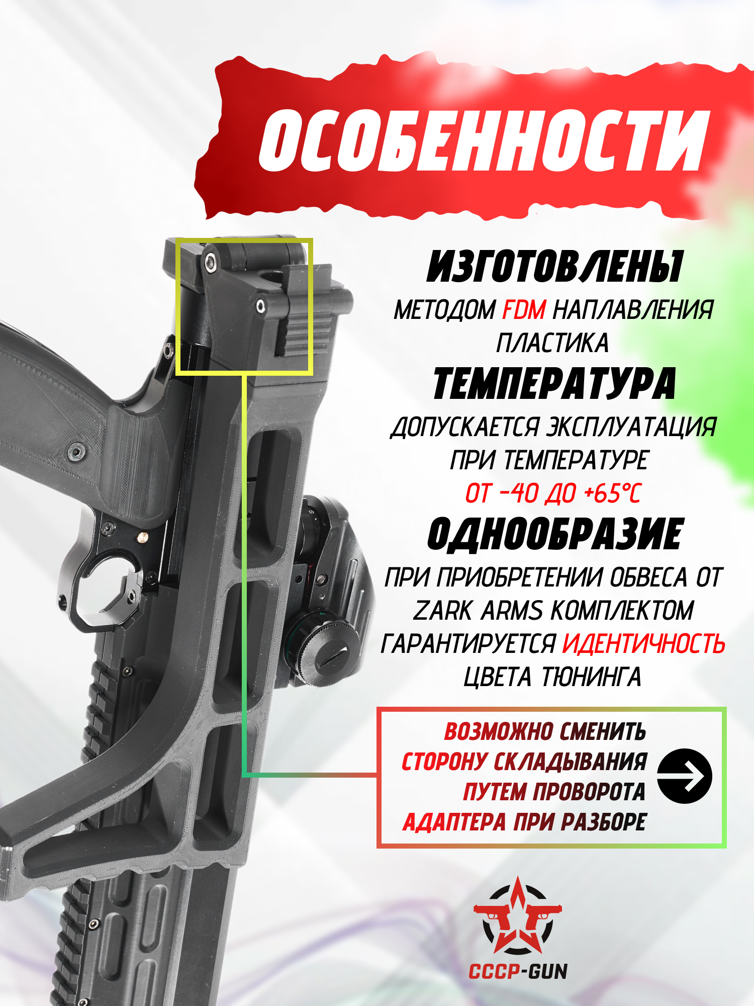 Приклад включает функцию смены направления складывания, благодаря чему пользователь может настроить обвес под свои задачи. Происходит это путем частичной разборки фиксирующего элемента, с помощью которого упор крепится к пистолету, и последующим разворотом подвижного узла.