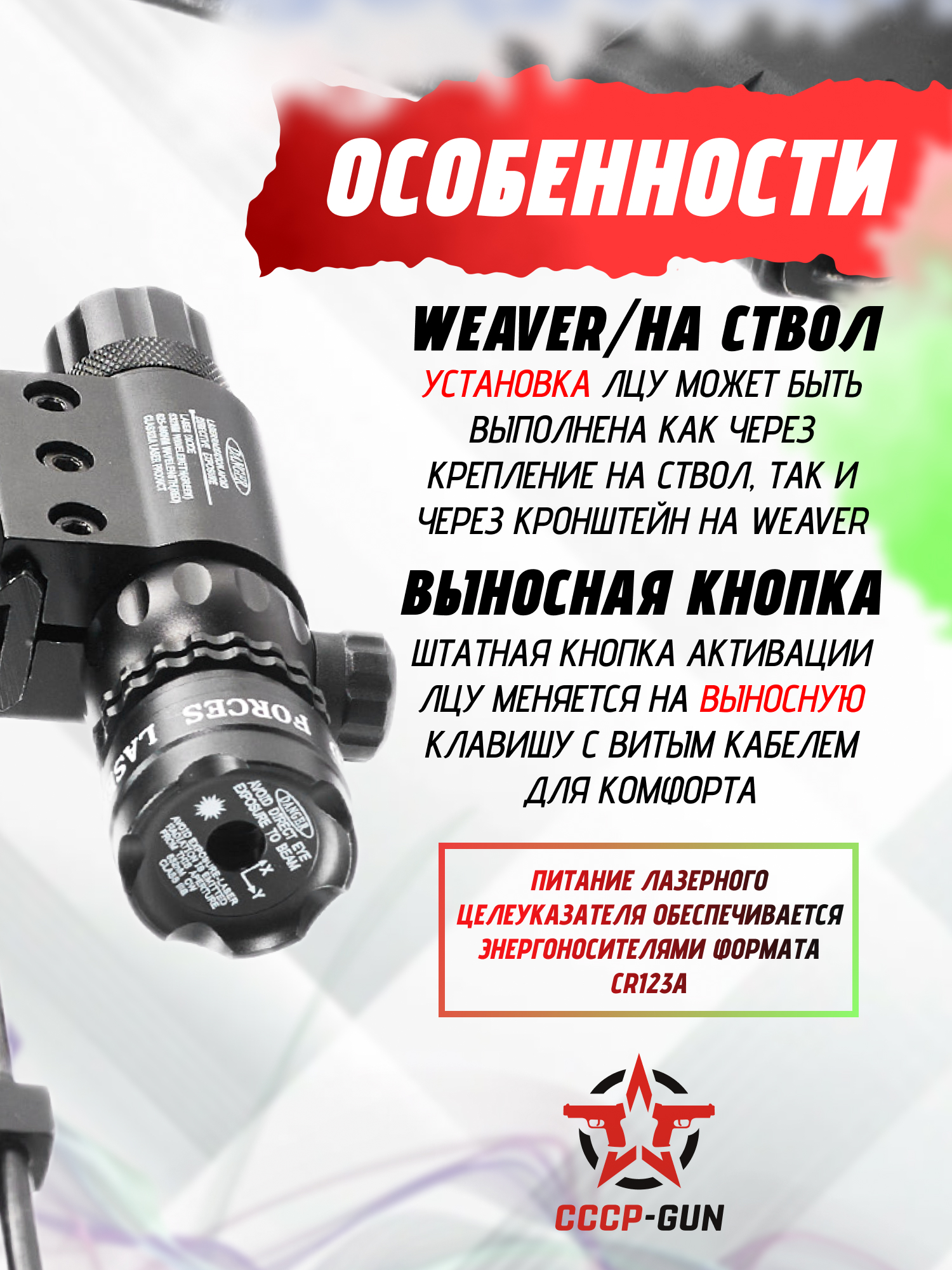 Цвет лазера модели - зеленый, а мощность ЛЦУ составляет 5 МВт. В солнечный день метка лазера может быть различима на расстоянии 100 метров от стрелка, а в ночное время, данное значение вполне может быть равно трестам метрам. Работа модели обеспечивается одной батарейка CR123A.