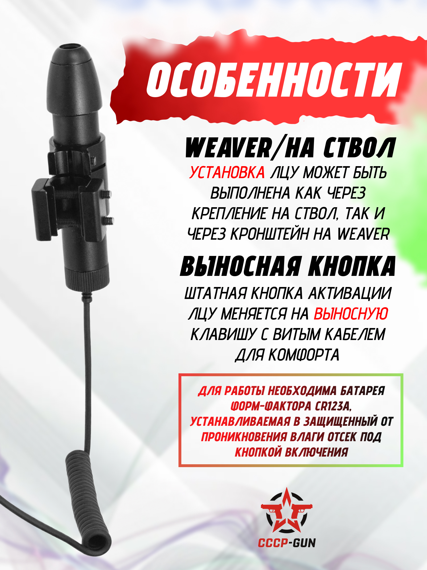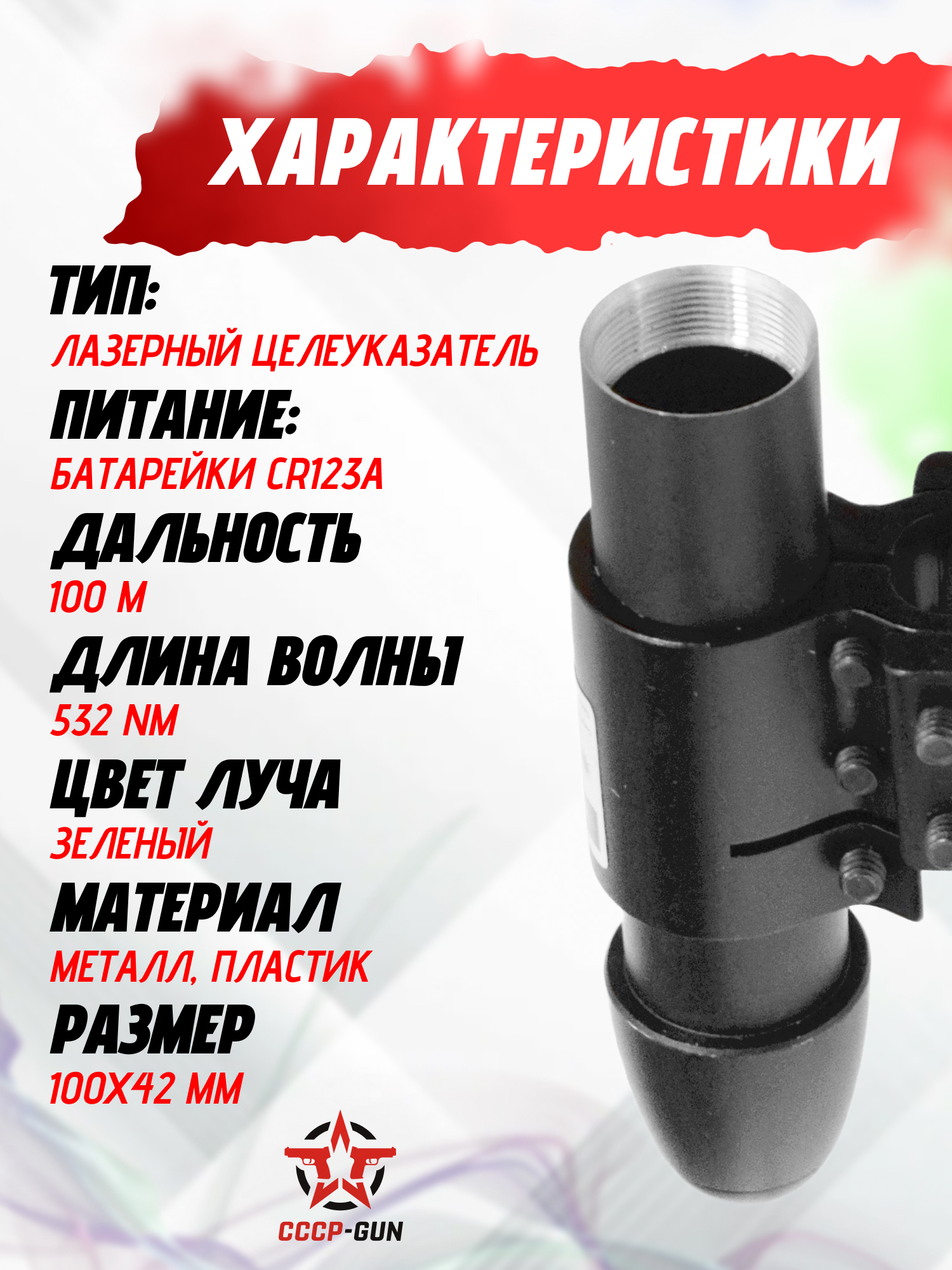 Цвет лазера данного устройства - зеленый, причем его мощность составляет 5МВт, что позволяет увидеть метку лазера на расстоянии 100 метров днем, а так же, 300 метров - ночью. Работа модели обеспечивается батарейкой типа CR2.