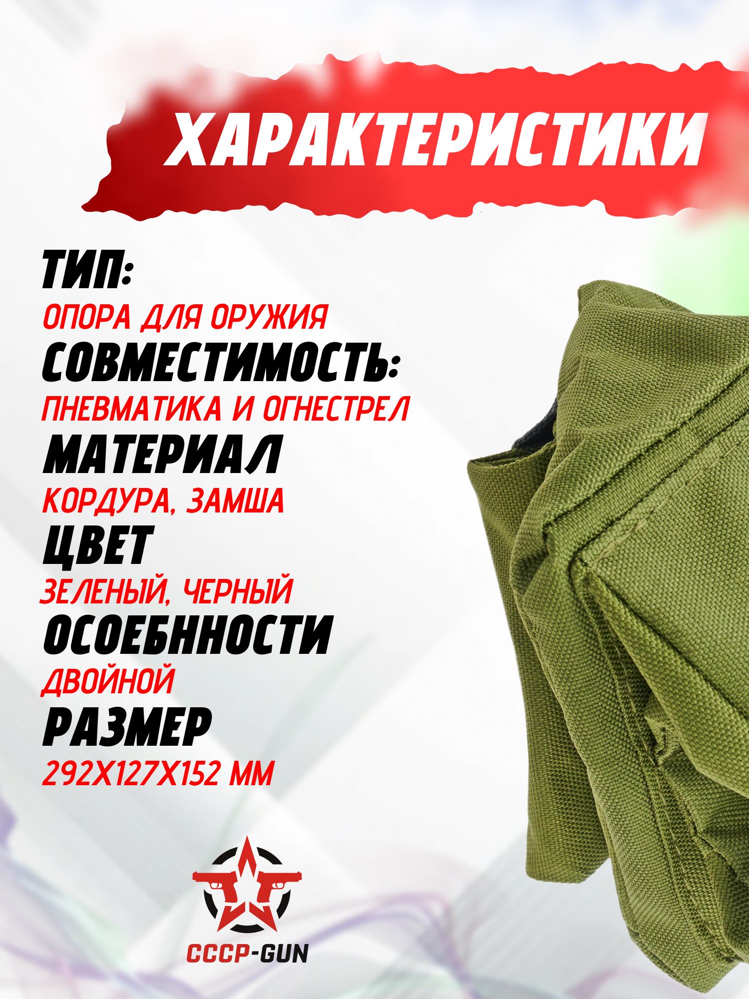 | Особенности | Опоры сделаны из очень прочного материала кордура (тип нейлона), имеют нескользящую верхнюю часть из кожзаменителя, что не дает оружию скользить во время выстрела. |
