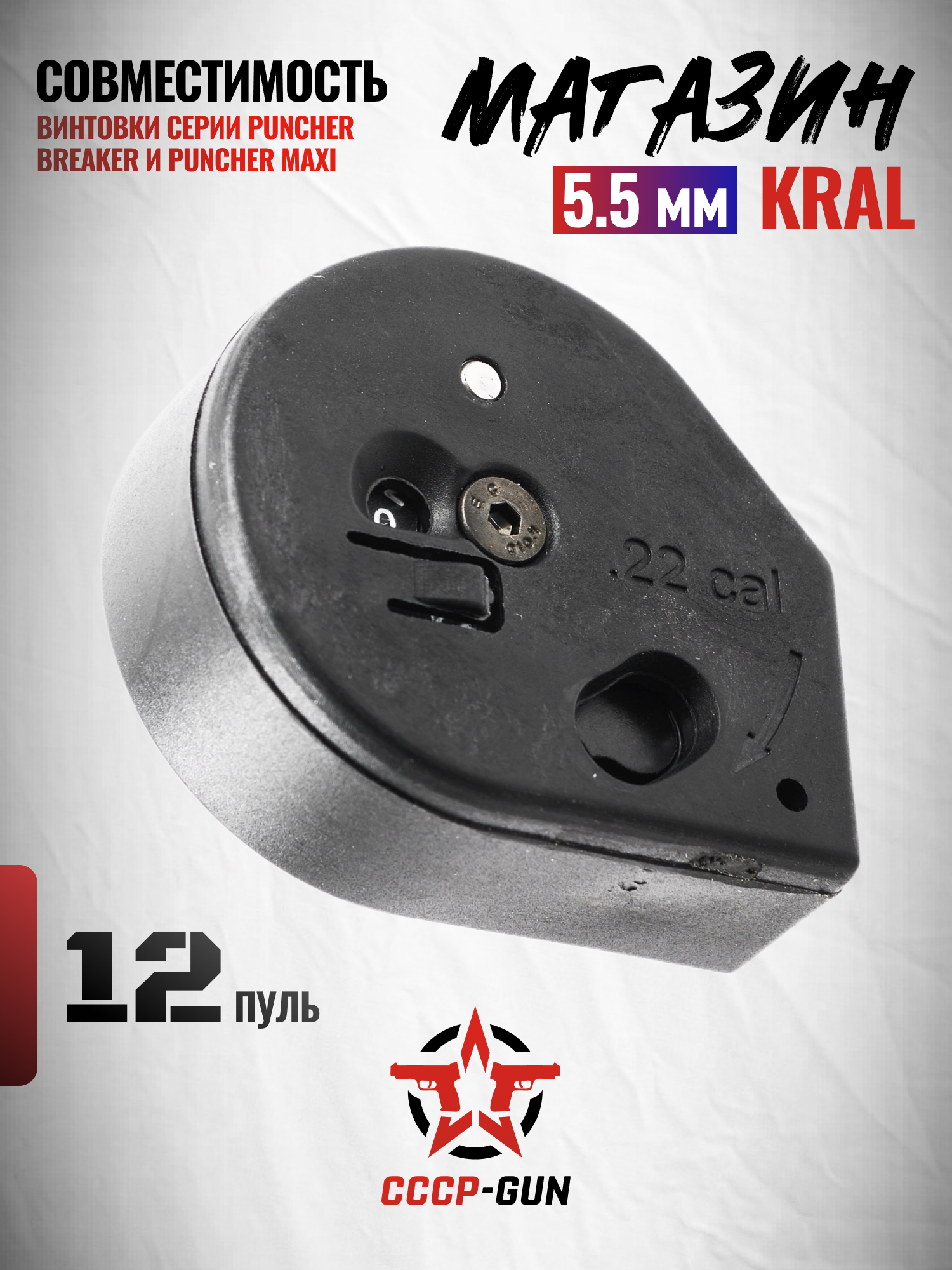 Магазин Kral .22 (5.5 мм) имеет ёмкость на 12 снарядов. Виды свинцовых пуль такого калибра имеют различные виды и массу. Данный магазин способен использовать любые из них от простых полуграммовых воланчико-образных, до тяжелых оживальных. Правда для последних, потребуется соответствующая мощная винтовка.