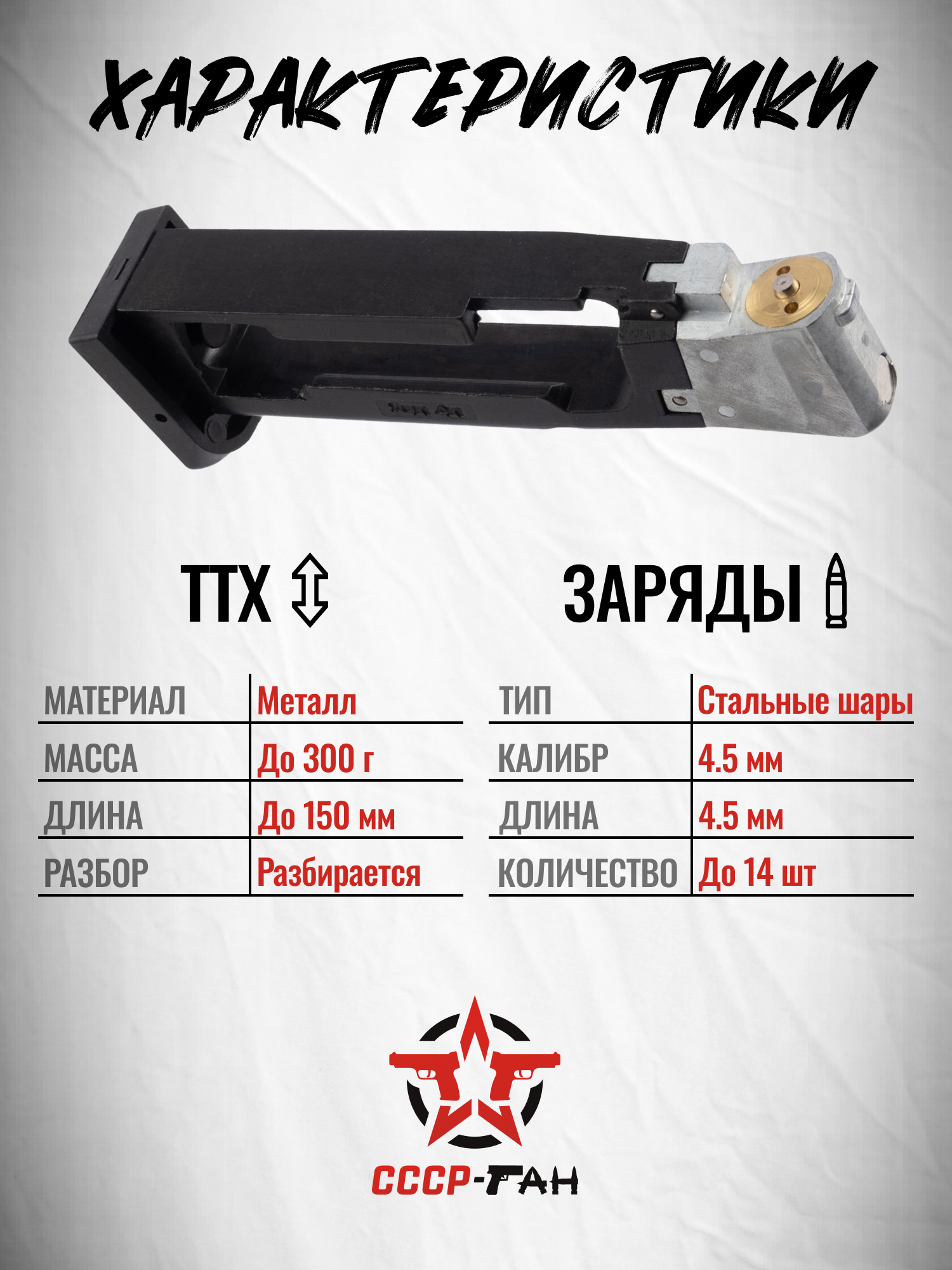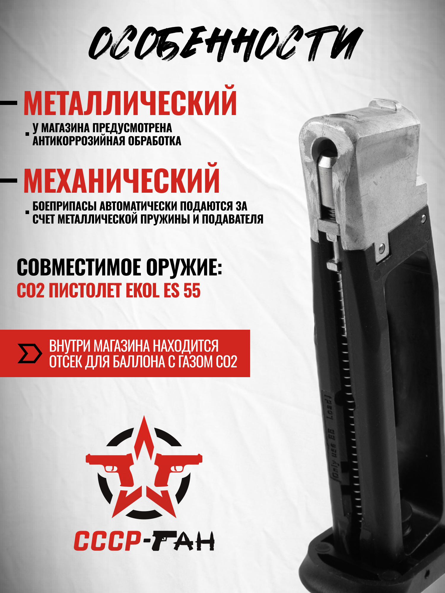 Представленный элемент боепитания предназначается для установки в пневматический пистолет Ekol ES 55 - в качестве снарядов для метания применяются стальные пули сферической формы калибра 4.5 миллиметров. Боекомплект помещается во внутренний тракт накопителя через отверстие в верхней части подавателя. Боеприпасы выстраиваются линейно и постоянно поджимаются бегунком с витой пружиной, благодаря чему реализуется стабильное и своевременное перемещение каждого заряда.